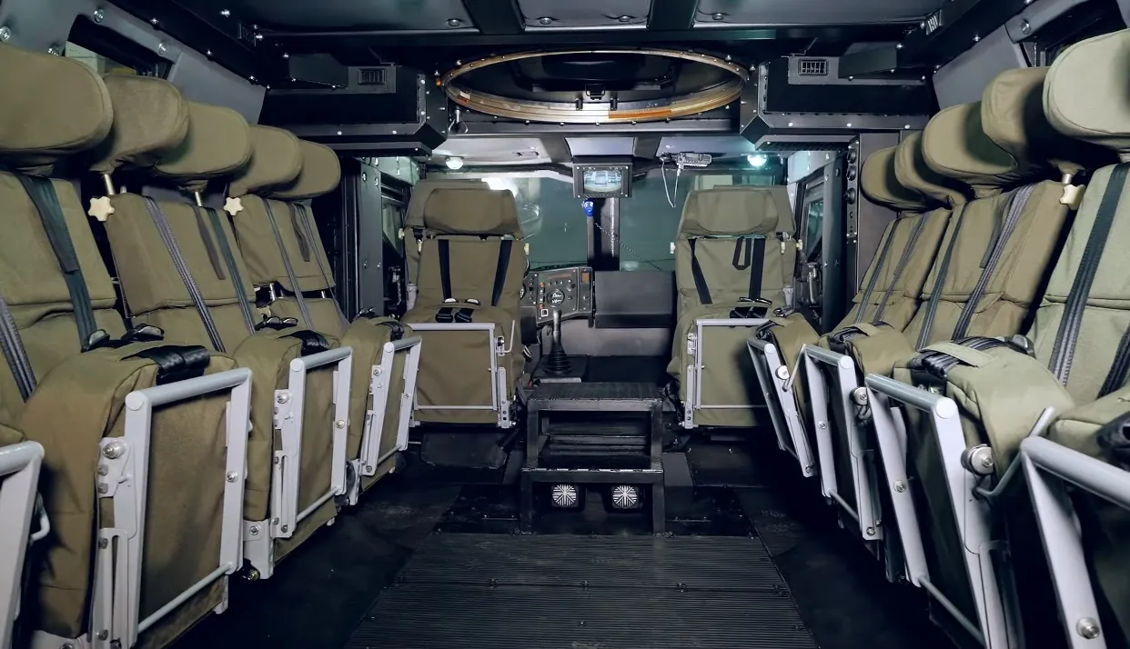 Внутреннее пространство цельнообъемное, в нем могут размещаться 16 человек, включая механика-водителя. Все сиденья являются взрывозащищенными и эргономическими. Для комфортного размещения личного состава используется раздельная система вытяжной вентиляции и кондиционирования - для кабины и отделения десанта.