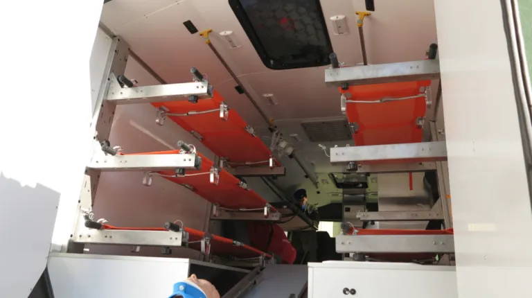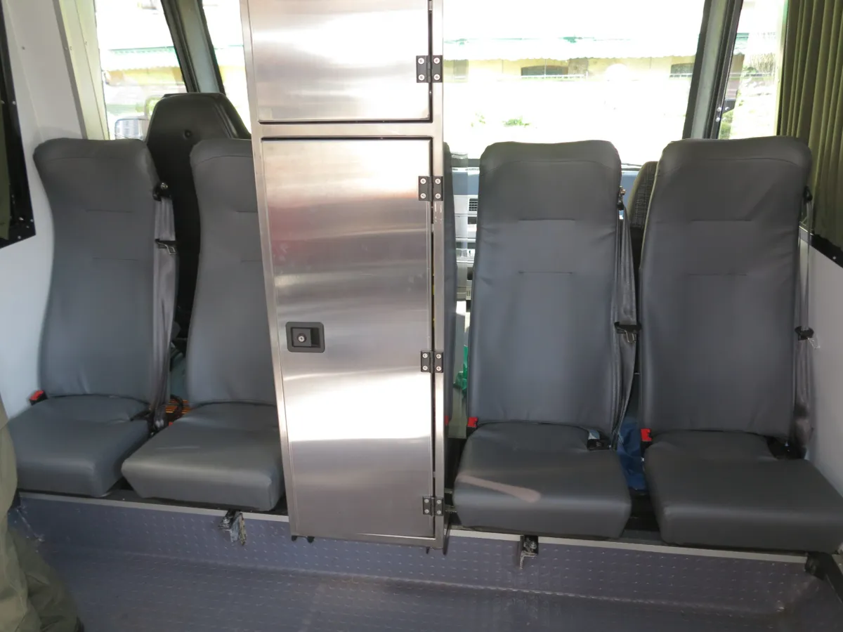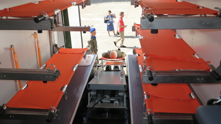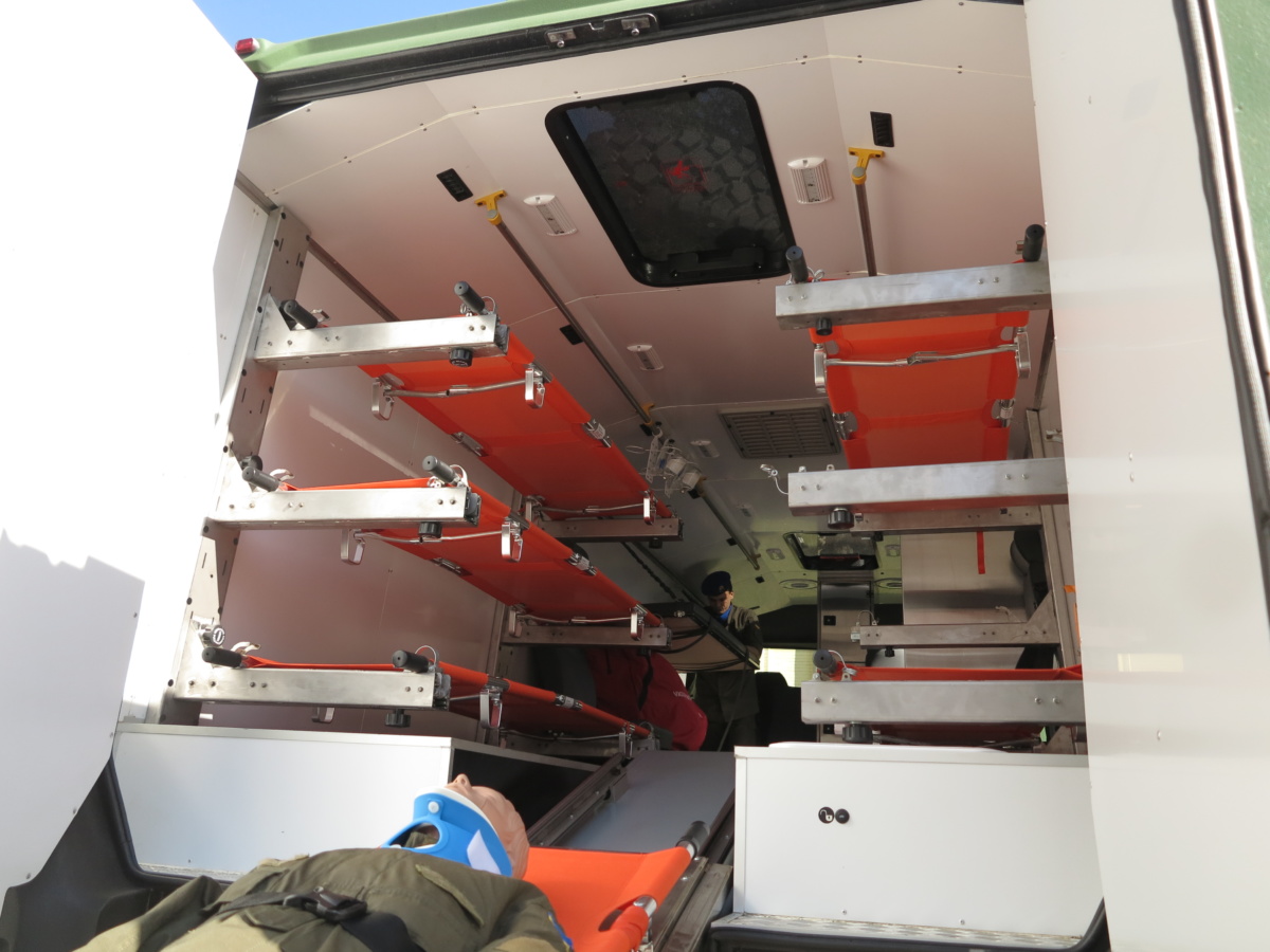 Медицинский эвакуационный автобус на базе Torsus Praetorian условно разбит на две основные части. Передняя с посадочными местами для медицинского персонала и технологическими ящиками/нишами. Задняя – с гидравлическим подъемником и съемными местами для носилок.