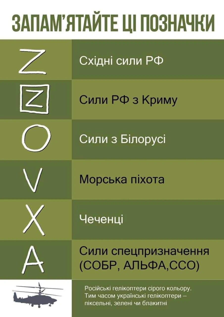 Йде шостий день війни з російськими окупантами на українській землі. Нашою територією роз'їжджають сотні одиниць ворожої техніки. Щоб правильно ідентифікувати тих, хто сидить в них, Міністерство оборони опублікувало таблицю зі спецзнаками білого кольору, які можуть бути нанесені на кабіни і кузова вантажних автомобілів, а також борти бронетехніки. Як показує практика, найбільше за ці дні було підбито і захоплено машин з буквами Z і V.