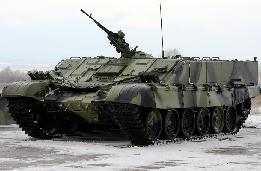БМО-Т, или объект 564 построен на базе танка Т-72 и имеет боевую массу 43,9 т. Вместо башни с пушкой здесь десантный отсек на 7 человек. Главное вооружение – 30 переносных реактивных пехотных огнеметов калибра 93 мм – РПО-А “Шмель”.
