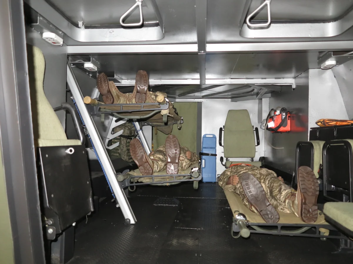 Санитарный бронетранспортер может перевозить трех раненых на носилках или несколько раненых на откидных сиденьях по бортам. БТР имеет усиленную баллистическую защиту – ПЗСА-5 по ДСТУ 3975, средства противоминной защиты – с многослойным полом.