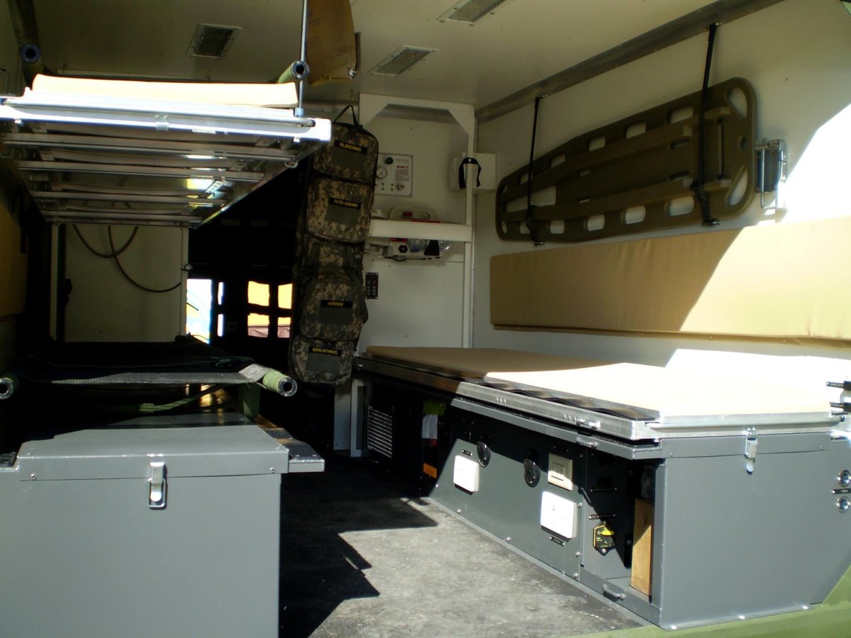 Санитарные автомобили Hummer имеют довольно вместительный кузов. Здесь могут разместиться до 4 раненных бойцов на носилках или до шести раненных в положении сидя. Внутри самое необходимое медицинское оборудования, включая аппарат для подачи кислорода.
