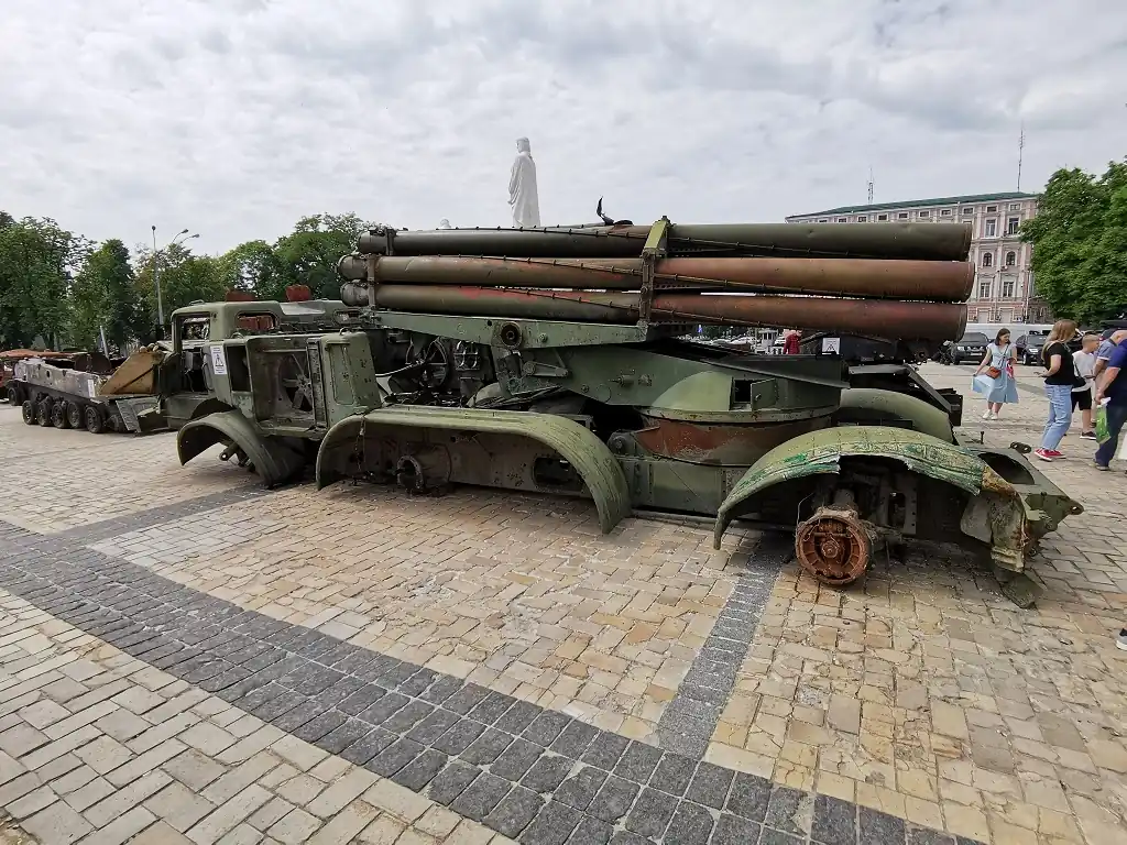 Поруч стоїть ще одна РСЗВ, поменше – БМ-21 "Град". Вона здатна робити залп із 36 – 40 реактивних снарядів на відстань до 42 км. Установку було знищено нашими Силами оборони в Київській області.
