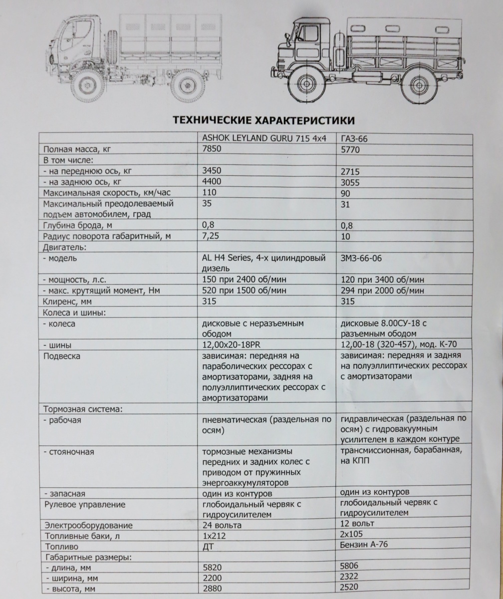 Как видно из приведенных ниже таблиц, Ashok Leyland Guru 715 (4х4) имеет очень схожие с ГАЗ-66 габаритные размеры. Он длиннее всего на 2 см, на 12 см уже и выше на 36 см. Машина перевозит на 500 кг больше «шишиги» – 2500 кг, правда у него существенно больше полная масса – 7850 против 5770 кг.