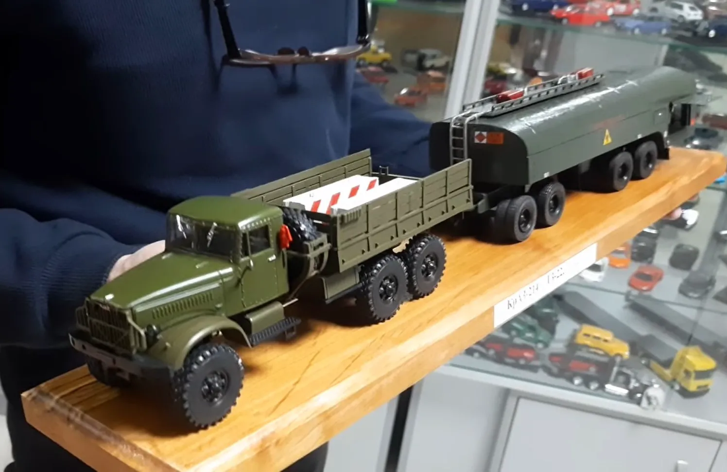 Автомобілі КрАЗ свого часу активно використовувалися у складі напівпричепів-цистерн в якості аеродромних паливозаправників. Найпоширенішою моделлю є ТЗ-22 із тягачом КрАЗ-258 (6х4). Однак не всі знають, що до цього напівпричепа міг бути під’єднаний підкатний візок (одно- чи двовісний), завдяки чому для буксирування замість сідлового тягача можна було використовувати армійський бортовий автомобіль, такий, наприклад, як КрАЗ-255Б1 (6х6). Саме таке, досить рідкісне зчеплення і відтворили у Вінницькому музеї моделей транспорту.