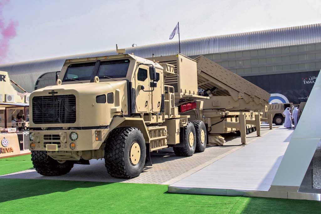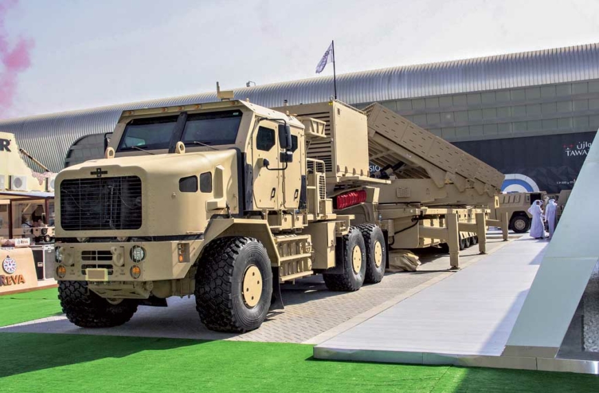 Еще одна новинка – бронированный седельный тягач Oshkosh Heavy Equipment Transporter (HET) демонстрировался вместе с пятиосным полуприцепом (см. заглавное фото), на котором были смонтированы четыре пусковые установки реактивной системы залпового огня MCL (Multiple Cradle Launchers). Она разработана арабской компанией Jobaria Defense Systems (JDS) и оснащается 122-мм ракетами Roketsan турецкого производства. Каждая пусковая установка содержит три модуля по 20 снарядов. Таким образом, за один залп артиллерийская система способна выпустить 240 неуправляемых ракет. Максимальная дальность стрельбы – 40 км, минимальная – 16 км. Тягач оборудован кондиционером и системой подкачки шин. В автомобиле размещена автоматизированная система управления огнем с инсталлированной спутниковой системой наведения.