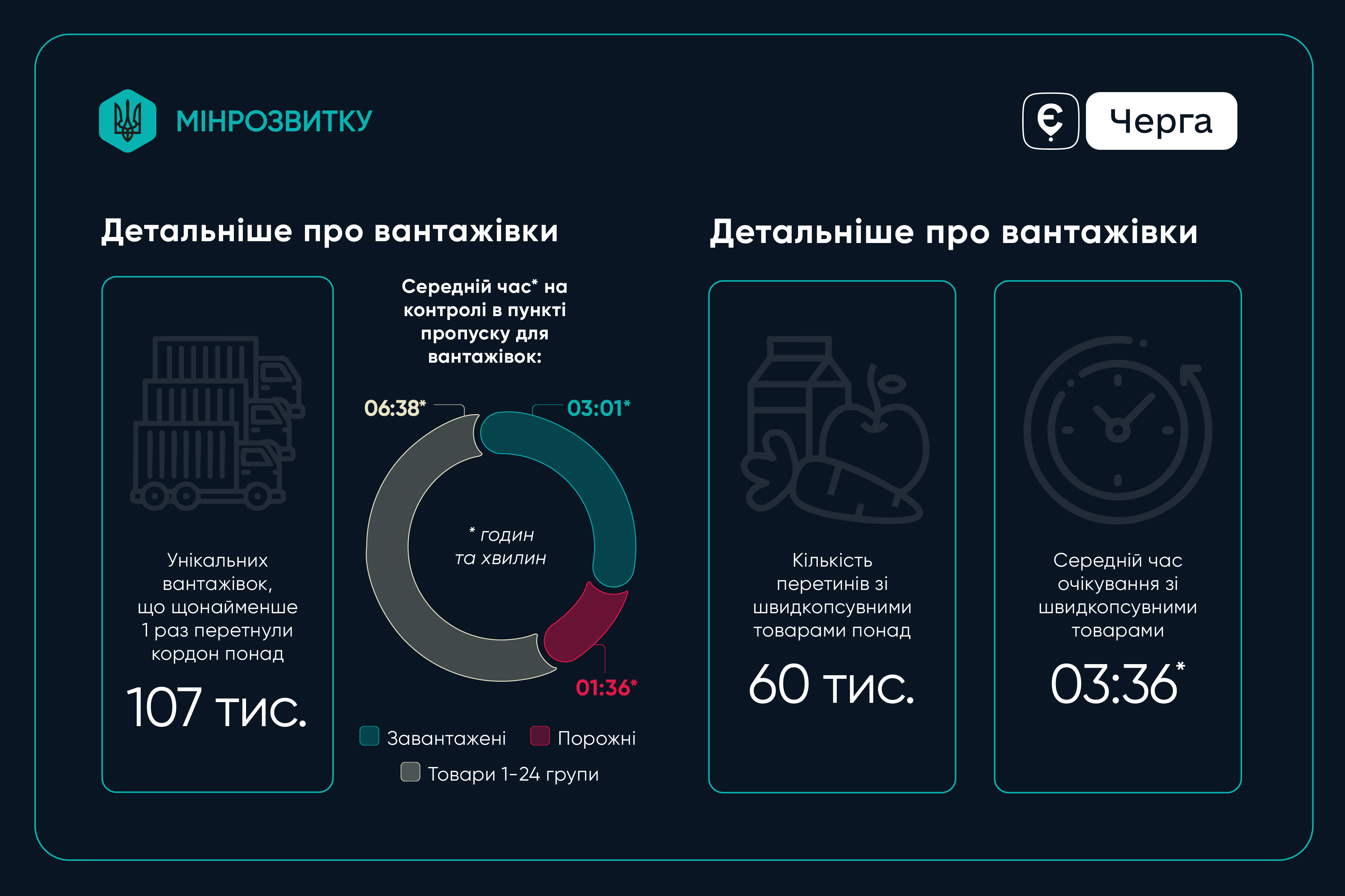 Загалом, в Системі зафіксовано понад 107 тисяч унікальних вантажівок, що перетнули кордон за записом щонайменше 1 раз. За цей же період відбулось понад 103 тисячі завантажень застосунку єЧерга.