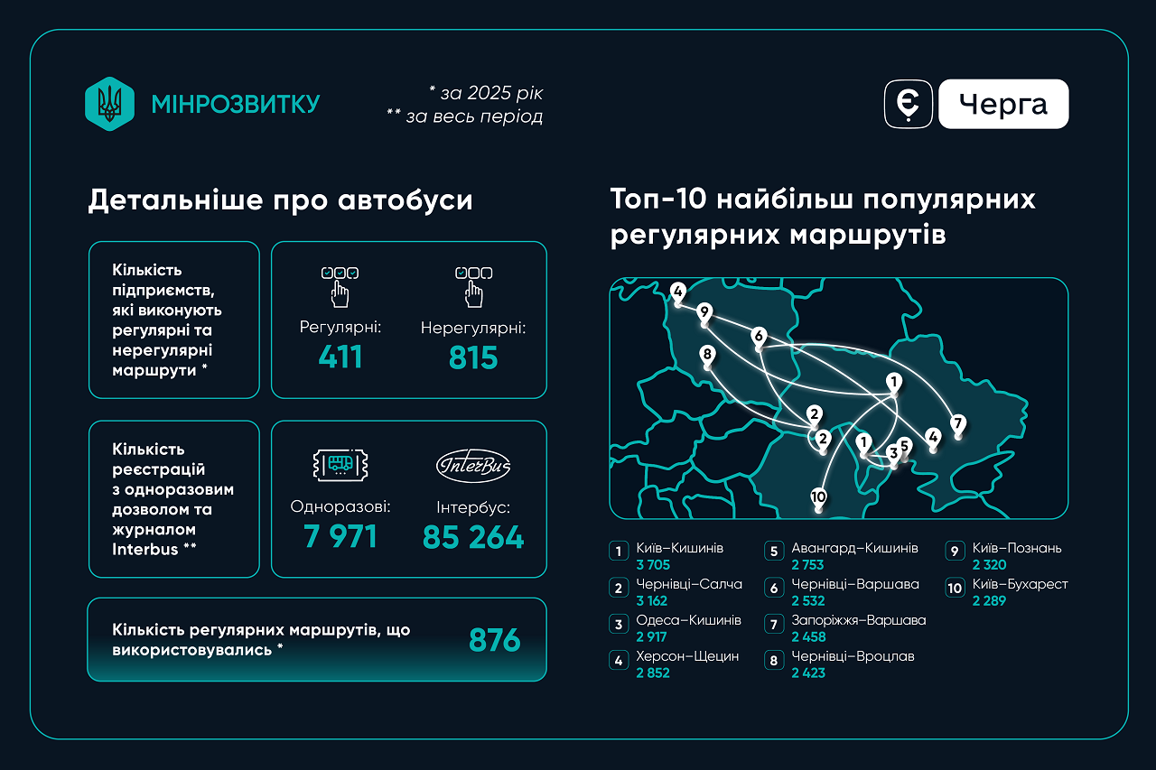 У цьому році в Системі зафіксовано 411 перевізників пасажирів, що виконували регулярні маршрути. Натомість тих, хто виконує нерегулярні рейси, вдвічі більше – 815. За цей же період за записом в єЧерзі було використано 876 регулярних маршрути, що прямують в різні країни.