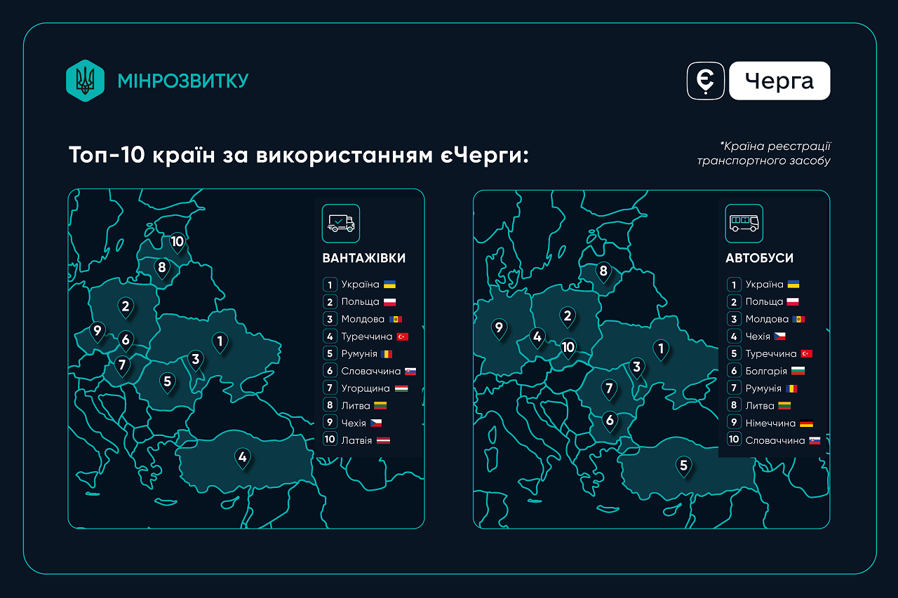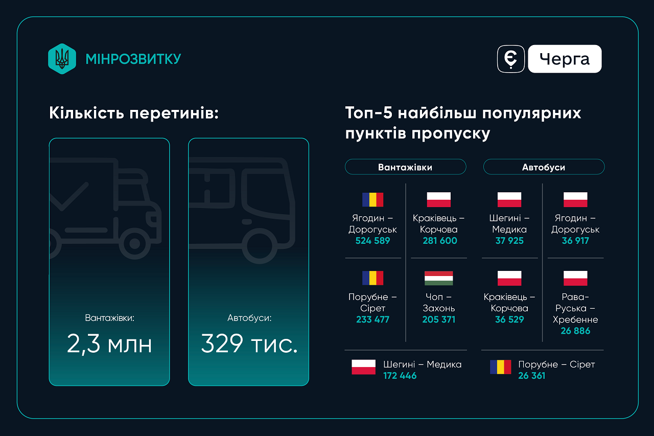 За три роки функціонування єЧерги українські та іноземні перевізники здійснили понад 2,6 млн перетинів кордону. З них – понад 2,3 млн перетинів відбулось вантажівками, 329 тисяч – це перетини кордону автобусами.