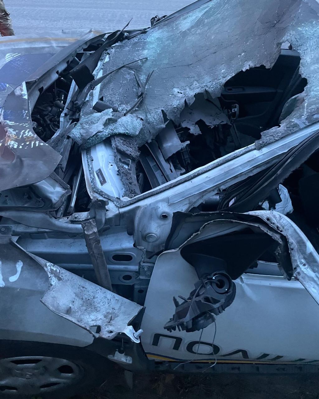 У поліцейського кросовера понівечена передня частина, двері з боку водія, а також розбиті шибки. Ще в нього розкурочена передня панель у салоні та спрацювали подушки безпеки. На щастя, обійшлося без жертв. Один із поліцейських отримав контузію.
