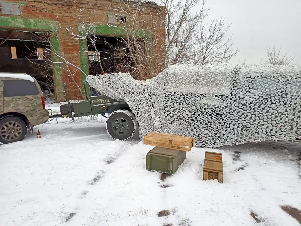 Над самим причіпом змонтована платформа, де розміщено маскувальну сітку. Таке рішення дозволить дуже швидко її розгорнути за потреби. Так само для “швидкісного використання” розроблені опори. Розташовані вони по кутах причепа, і задіяти їх можна максимально швидко. Під власною вагою вони випадають вниз, фіксуються - і причіп готовий до від'єднання від тягача. Адже часто розчіпку доводиться виконувати дуже хутко, час від часу навіть під вогнем противника.