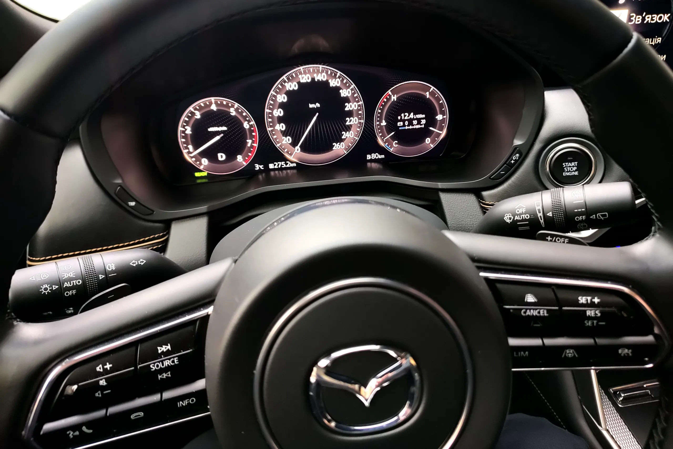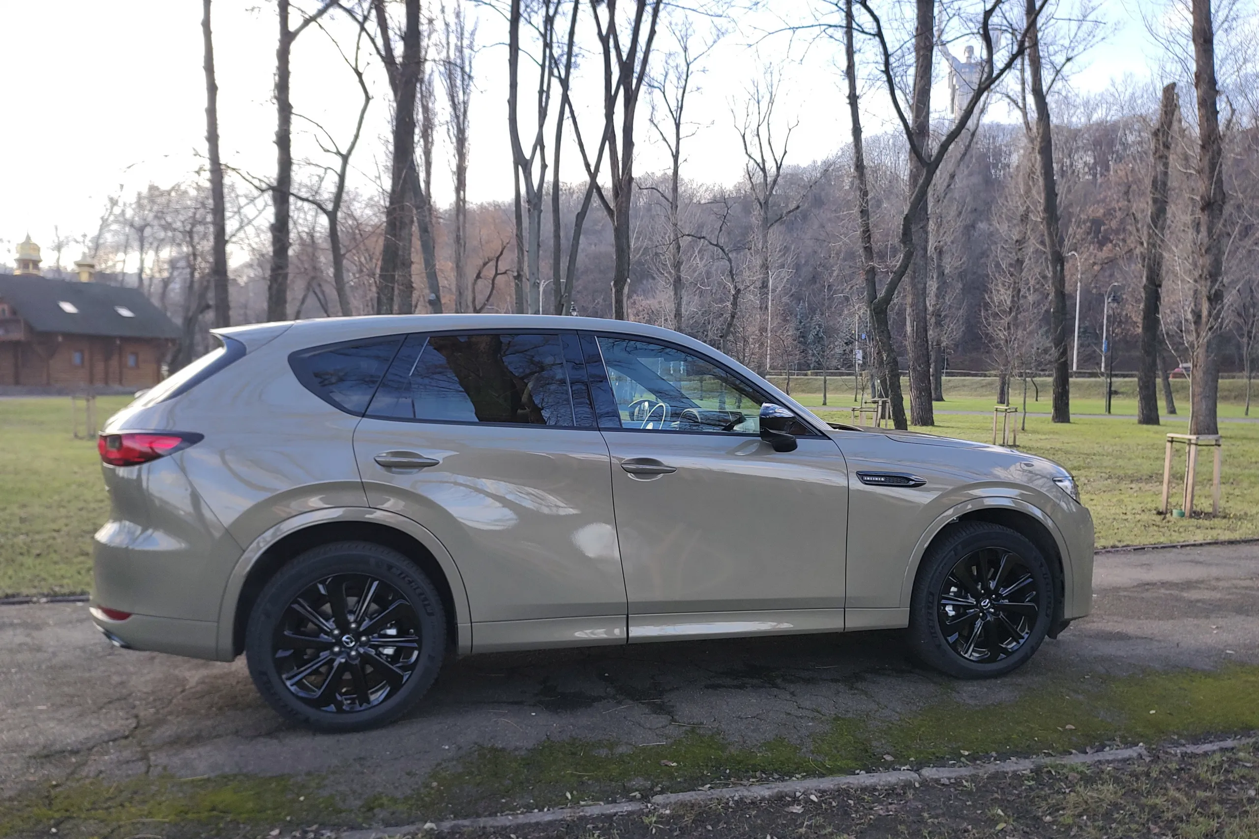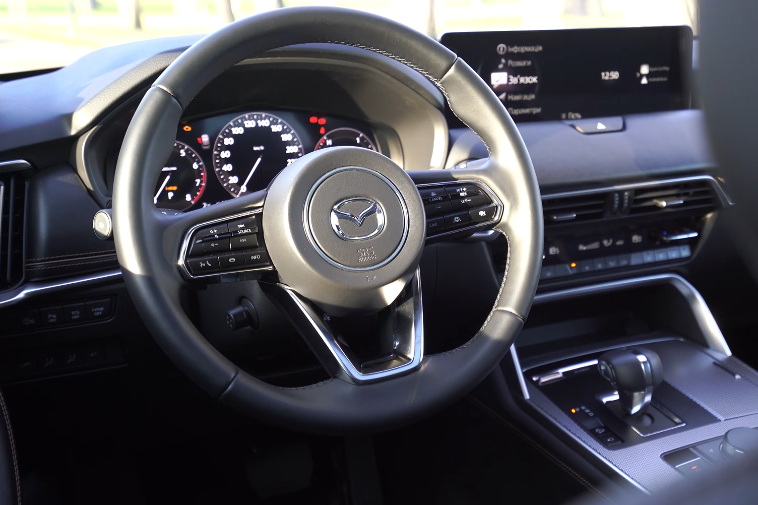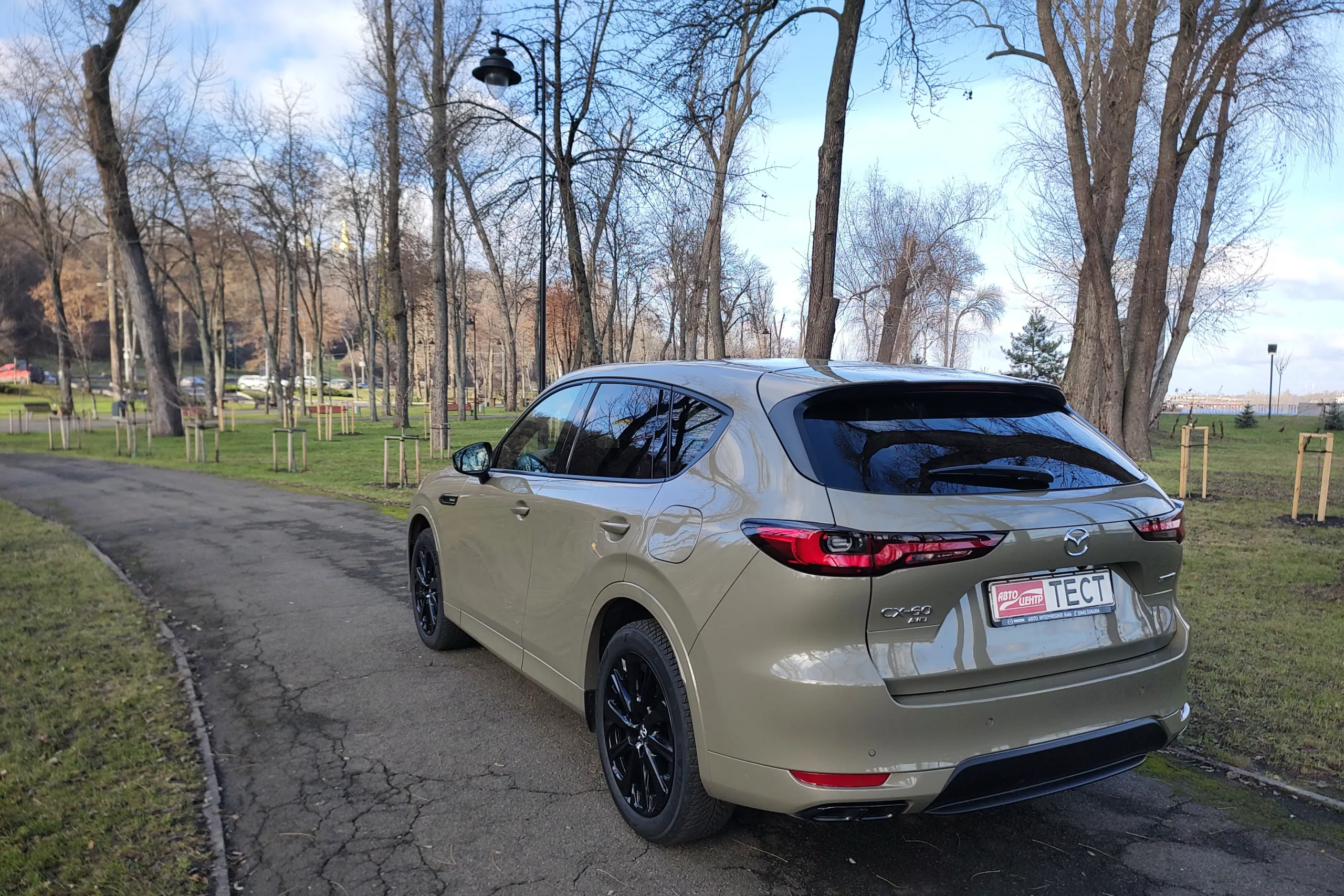 В основі кроссовера нова масштабована платформа призначена для продольного розташування двигуна. На ній збудовані як CX-60, так і CX-90. Під капотом — рядна турбована «щістка» об’ємом 3,3 літри, потужністю 284 кінські сили та крутним моментом 450 Нм. Вона оснащена системою м’якого гібрида MH-EV із використанням 48-вольтового стартер-генератора M-Hybrid Boost, системою рекуперативного гармування та невеличкою літій-іонною батареєю. За моїми відчуттями, у педалі акселератора ніби є два глобальних режими. Перший – це неквапливий. Тобто ви тримаєте оберти десь між холостими і двома тисячами, десь так, не більше. Цього цілком достатньо, щоб спокійно їхати в межах міського трафіку.