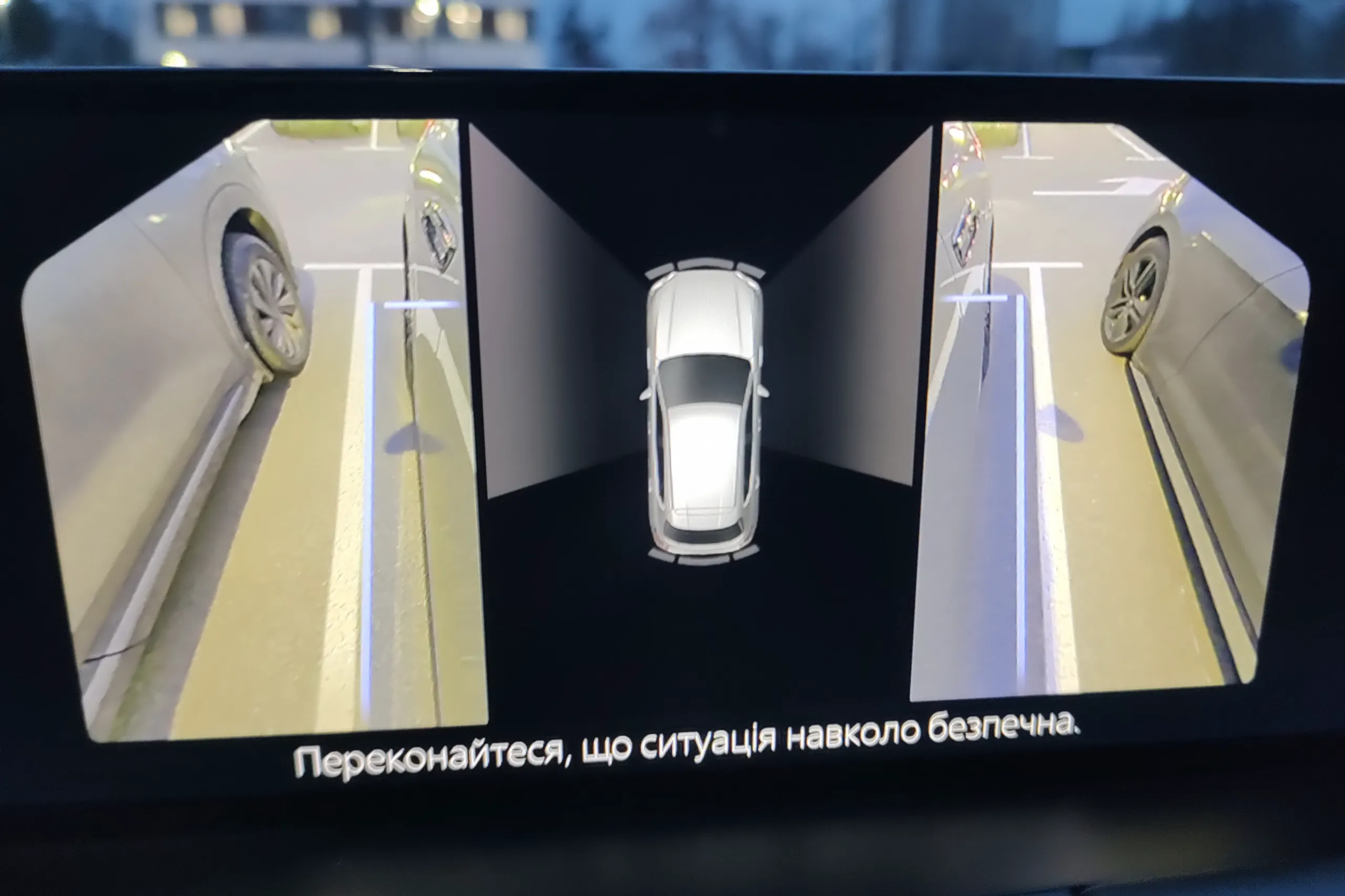 Екран мультимедіа прямокутного формату, зовсім невисокий і абсолютно не заважає оглядовості. Він має меню у чорно-білій гаммі, але коли ви під’єднаєте свій смартфон через Apple CarPlay або Android Auto, екран стає кольоровим. Так само, кольоровим він стає, коли вмикається камеру кругового огляду. Нагадаємо, що екран залишився не сенсорним, а керувати функціями допомогає класична «шайба» на центральній консолі та декілька кнопок. Все дуже зручно, інтуїтивно, та абсолютно зрозуміло.