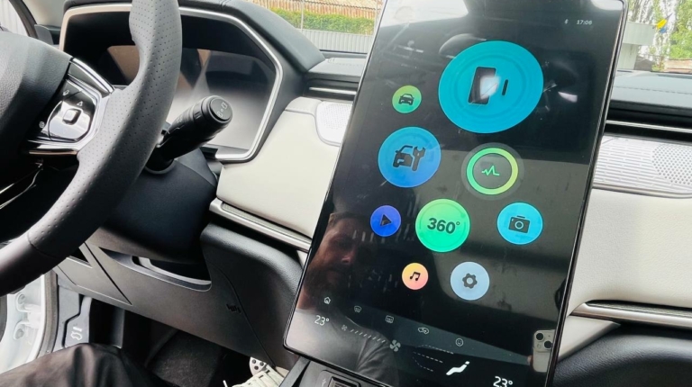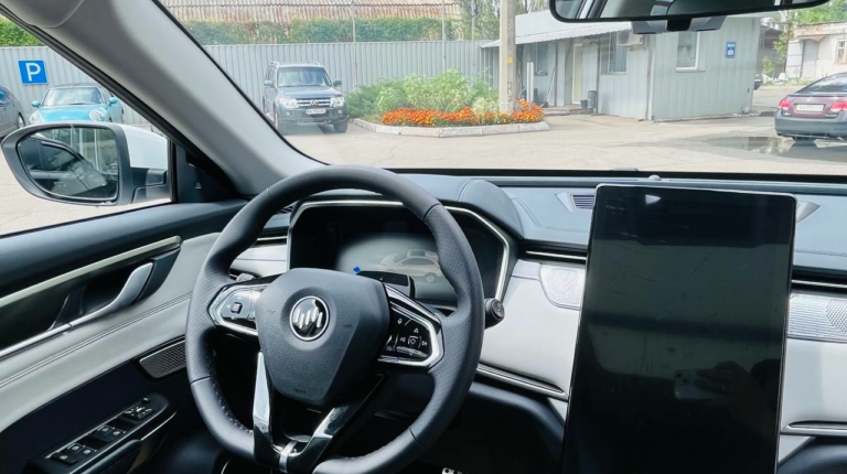 У салоні все у дусі сучасних «електричок». Велика цифрова панель приладів (12,3 дюйма), мінімум кнопок і великий 15,6-дюймовий екран на центральній консолі.