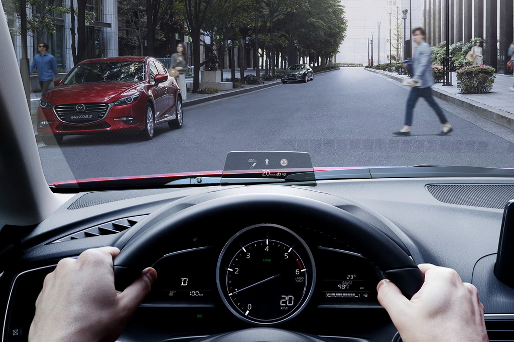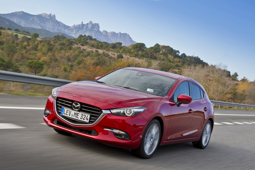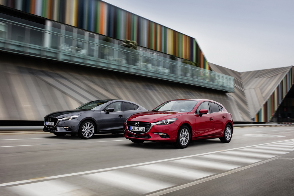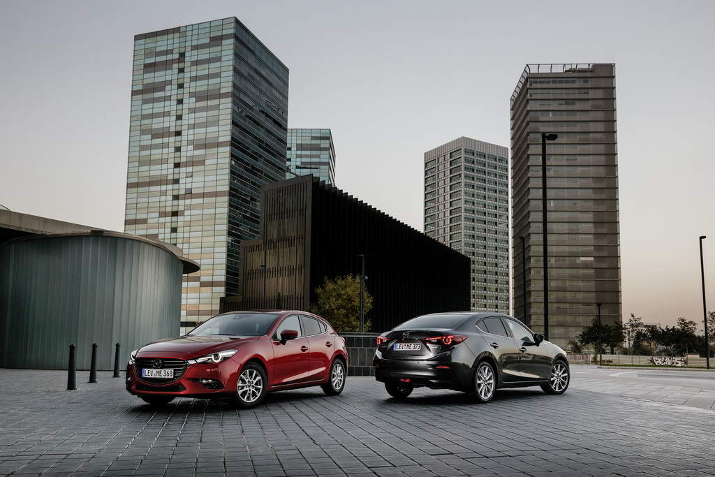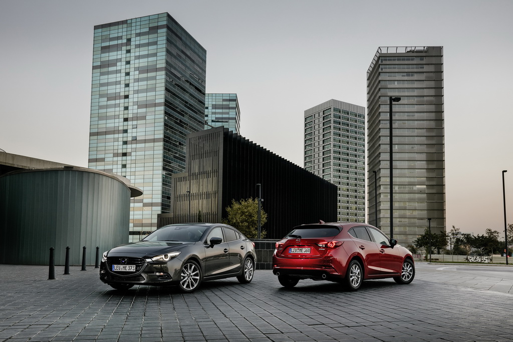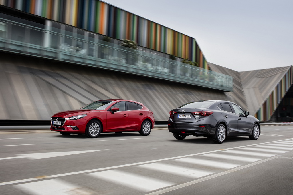 Mazda3 2017 модельного року отримала у свій арсенал покращений комплекс електронних систем допомоги водієві i-ACTIVSENSE, створений в рамках фірмової філософії Mazda Proactive Safety. Зокрема, наявність фронтальної камери дала змогу встановити вдосконалені системи автоматичного гальмування в міському трафіку Advanced SCBS і екстреного гальмування на трасі SBS, а також нову систему розпізнавання дорожніх знаків Traffic Sign Recognition. Зокрема, Advanced SCBS має ширший кут огляду, а швидкісний діапазон її роботи зріс до 80 км/год. А от система SBS тепер працює на швидкостях до 160 км/год (+15 км/год).