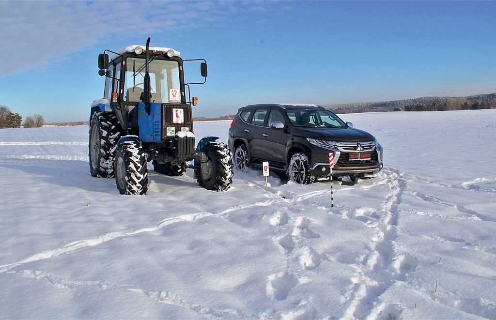 В продолжение испытаний нового Mitsubishi Pajero Sport мы свели его на одном перепаханном начерно озимом поле, покрытом 20-сантиметровым слоем снега, с трактором МТЗ «Беларус-80». Задача: прохождение 100-метровки в чистом поле – не на скорость, а на дальность.