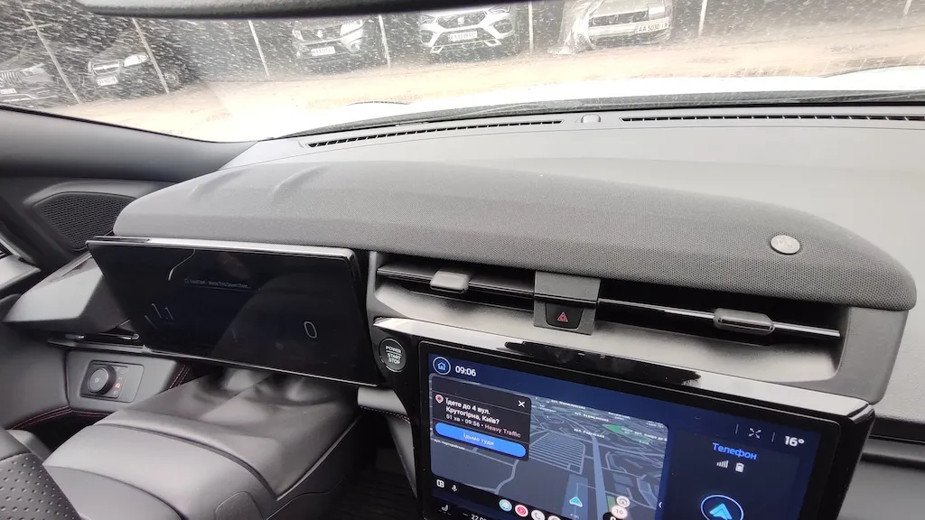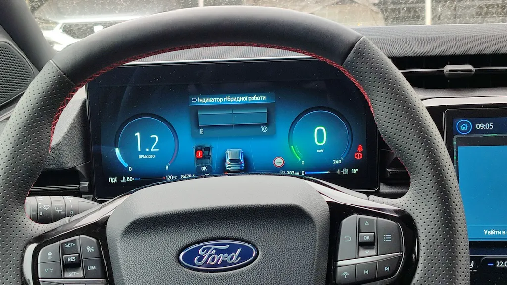 У салоні наша тестова версія в комплектації ST Line-Х виглядає дуже привабливо й неочікувано дорого, як для компактного кросовера. Першим у вічі кидається новий 12-дюймовий екран мультимедіа SYNC 4, що розміщений на центральній консолі. Система підтримує бездротові протоколи Apple CarPlay та Android Auto. Ще одне оновлення – внизу центральної консолі розташували майданчик для бездротової зарядки смартфона.