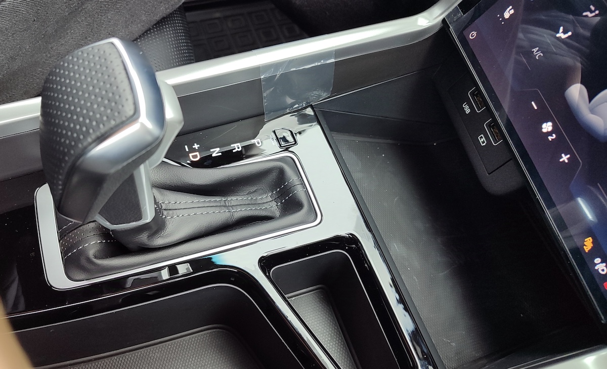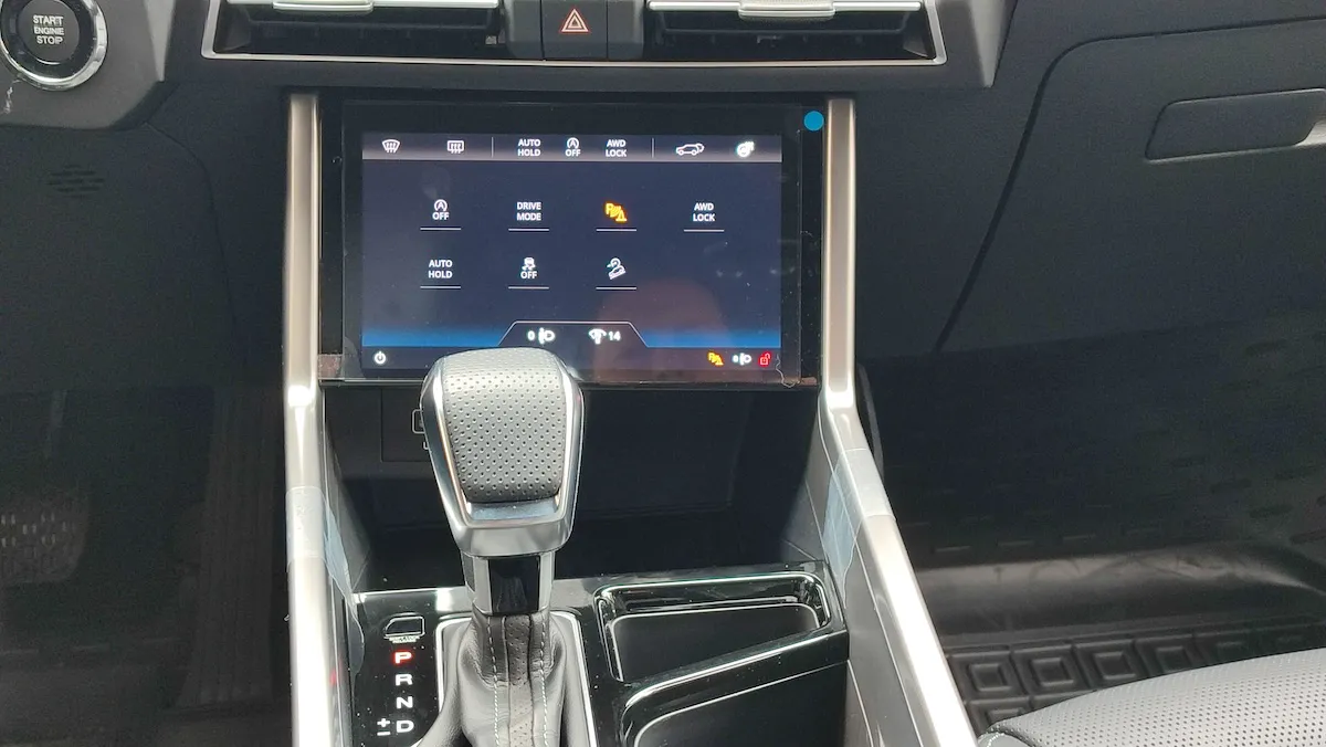 Цікаво, що є ще й третій екран. Він відповідає за налаштування клімат-контролю, а також додаткові налаштування автомобіля. Матовий екран інстальовано в центральну консоль. Якщо слайднути екран по горизонталі то від налаштувань клімату потрапляєш в додаткове меню. Тут можна обрати режими руху (Sport, Normal, Winter), активація допомоги спуску з гори, блокування міжосьового диференціалу та вимкнення системи стабілізації.