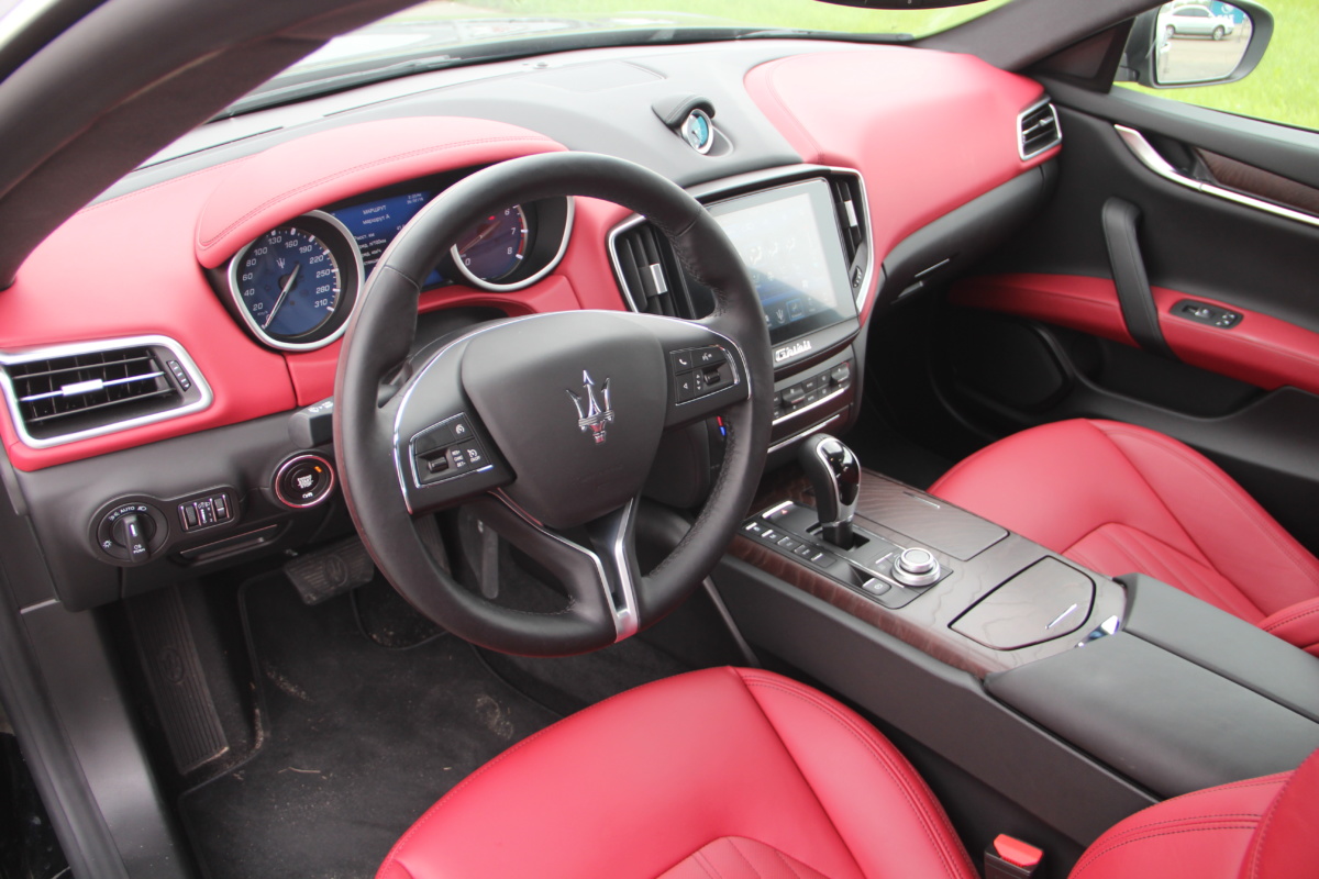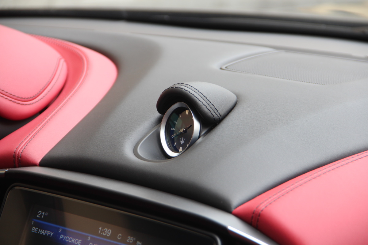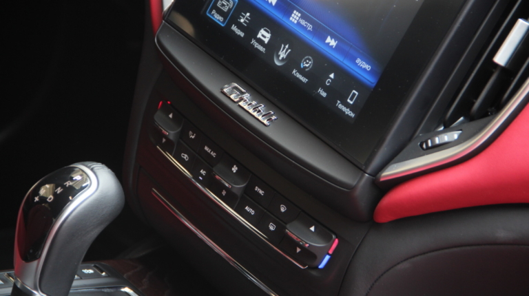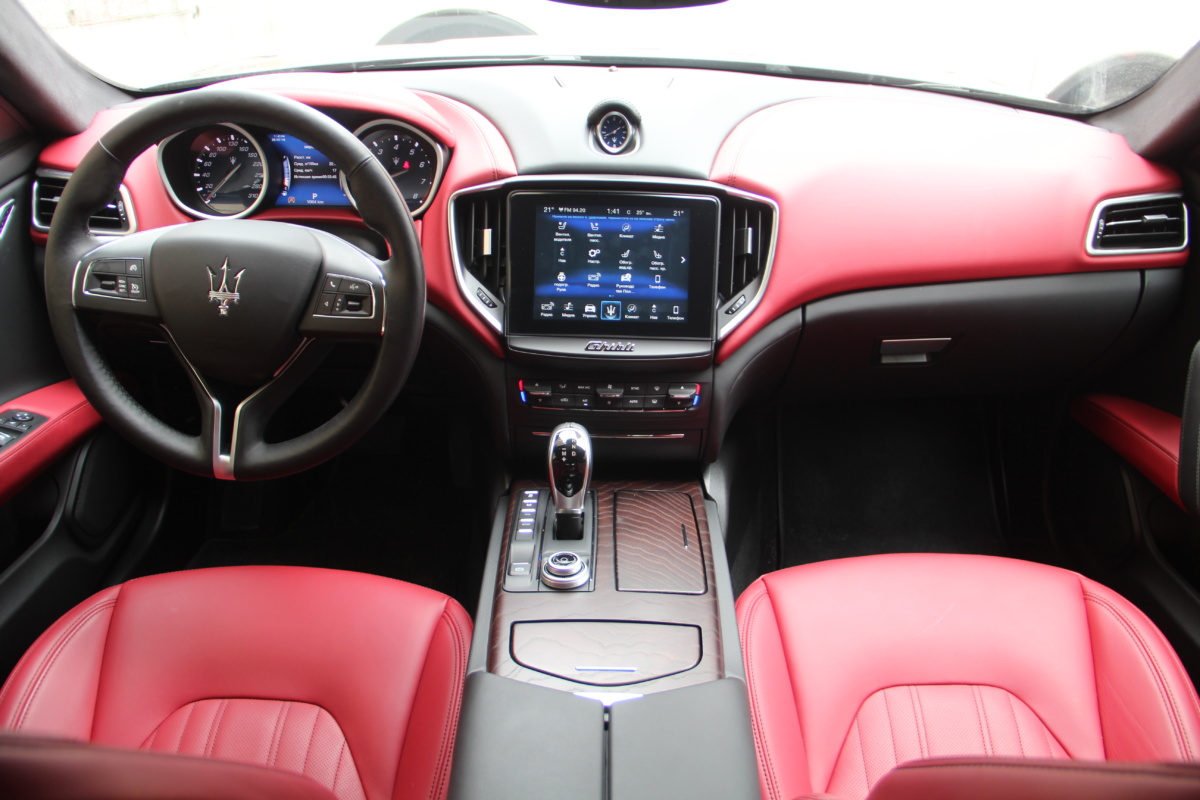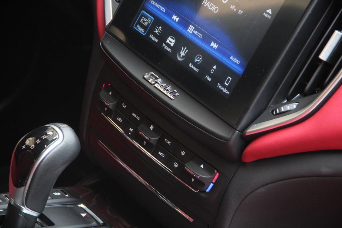 Как у Ferrari есть свой фирменный красный цвет для кузовов, так и у Maserati, похоже, есть характерный красный оттенок в отделке салона! Лично мне он напомнил модель 3200 GT – первая Мазерати, с которой мне довелось поближе познакомиться еще в начале 2000-х. Практически все элементы интерьера обшиты кожей, причем на дверных картах она полностью охватывает и торцы, что говорит о старании уделить внимание мелочам. Вариантов отделки может быть несколько и в тестовой машине далеко не самый роскошный. Но и салон тестовой Ghibli это царство кожи, так что оценивать приходится уже не мягкость пластиков, а ее выделку, строчку и так далее. Словно “обидевшись”, пластики здесь заметно уступают качеству кожи. Простоваты они для такого автомобиля как на вид, так и на ощупь.