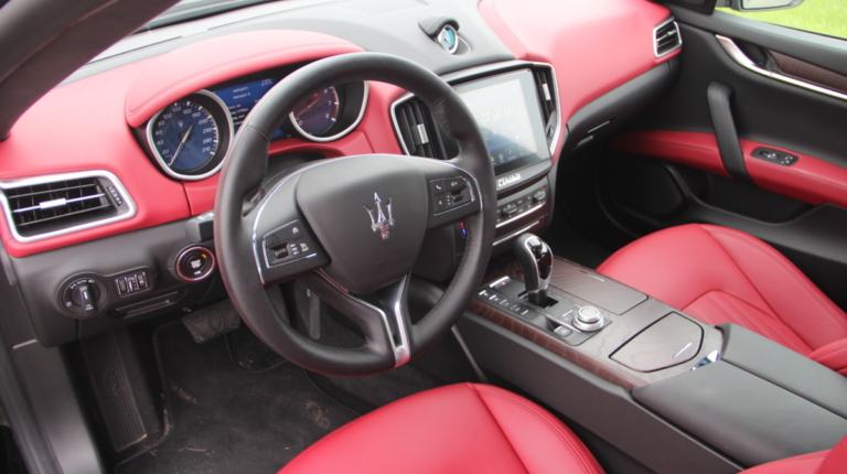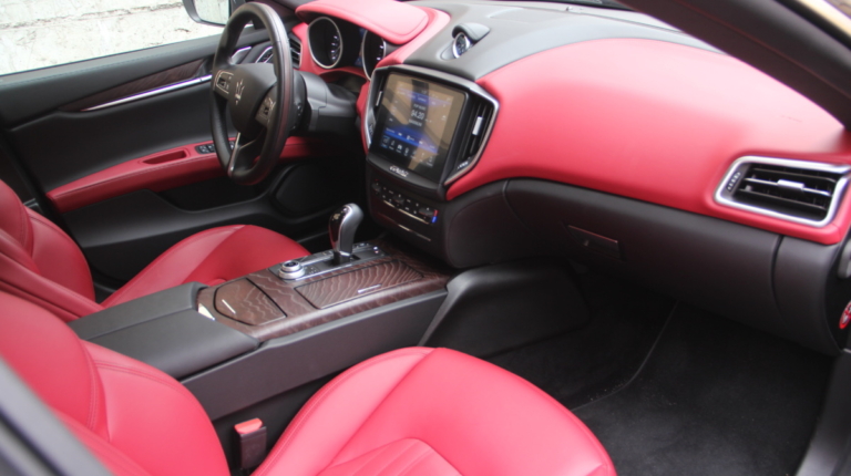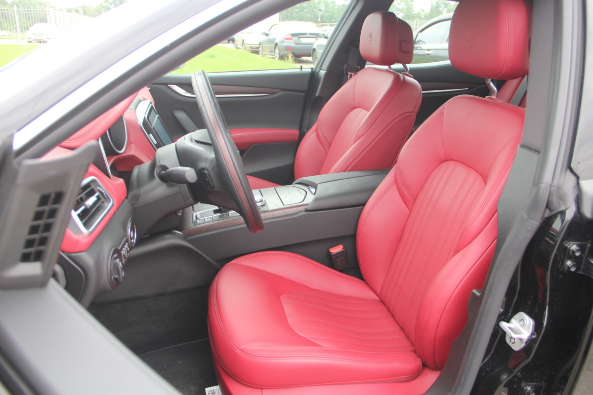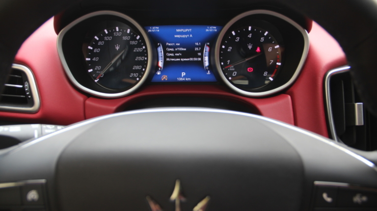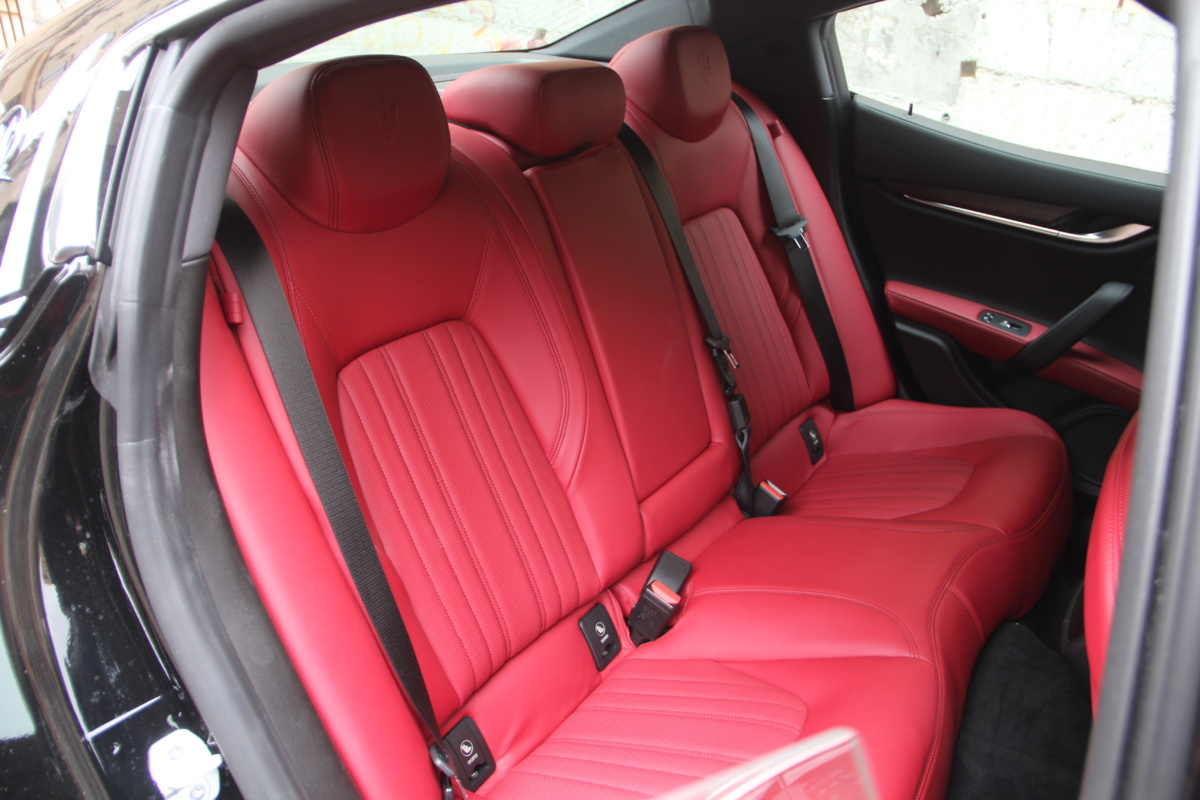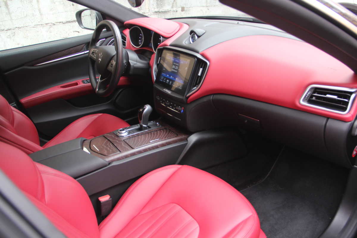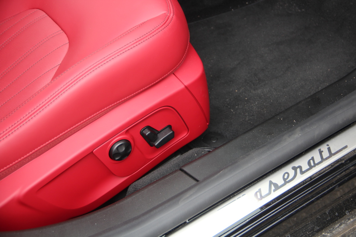 Как у Ferrari есть свой фирменный красный цвет для кузовов, так и у Maserati, похоже, есть характерный красный оттенок в отделке салона! Лично мне он напомнил модель 3200 GT – первая Мазерати, с которой мне довелось поближе познакомиться еще в начале 2000-х. Практически все элементы интерьера обшиты кожей, причем на дверных картах она полностью охватывает и торцы, что говорит о старании уделить внимание мелочам. Вариантов отделки может быть несколько и в тестовой машине далеко не самый роскошный. Но и салон тестовой Ghibli это царство кожи, так что оценивать приходится уже не мягкость пластиков, а ее выделку, строчку и так далее. Словно “обидевшись”, пластики здесь заметно уступают качеству кожи. Простоваты они для такого автомобиля как на вид, так и на ощупь.