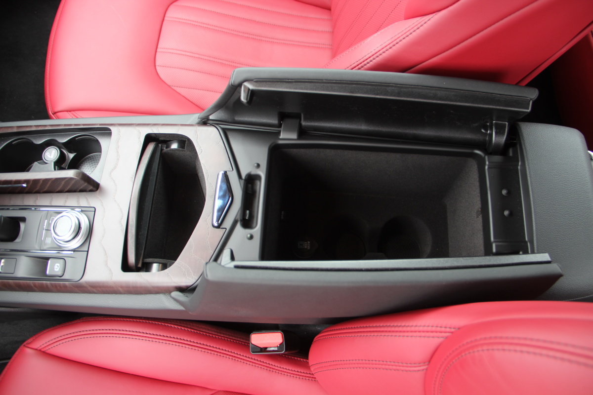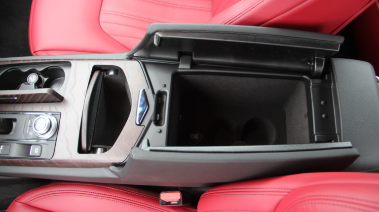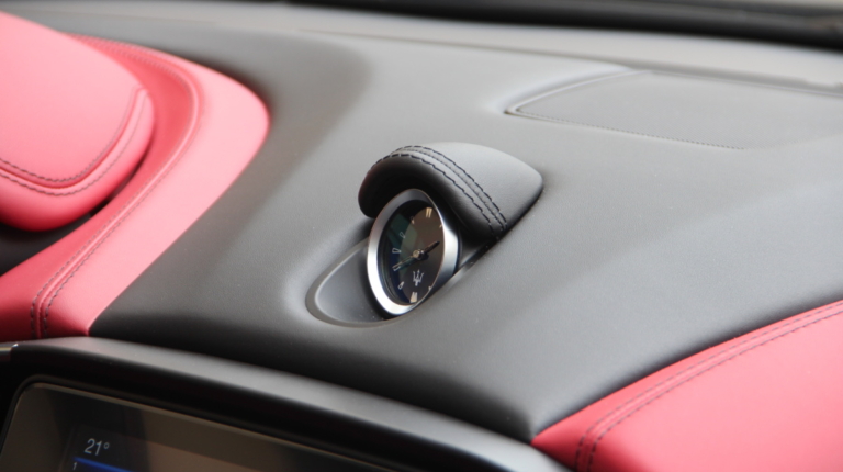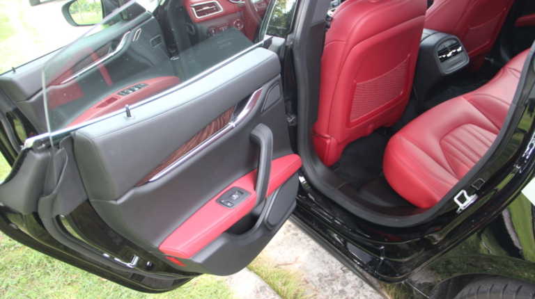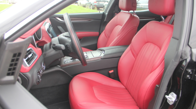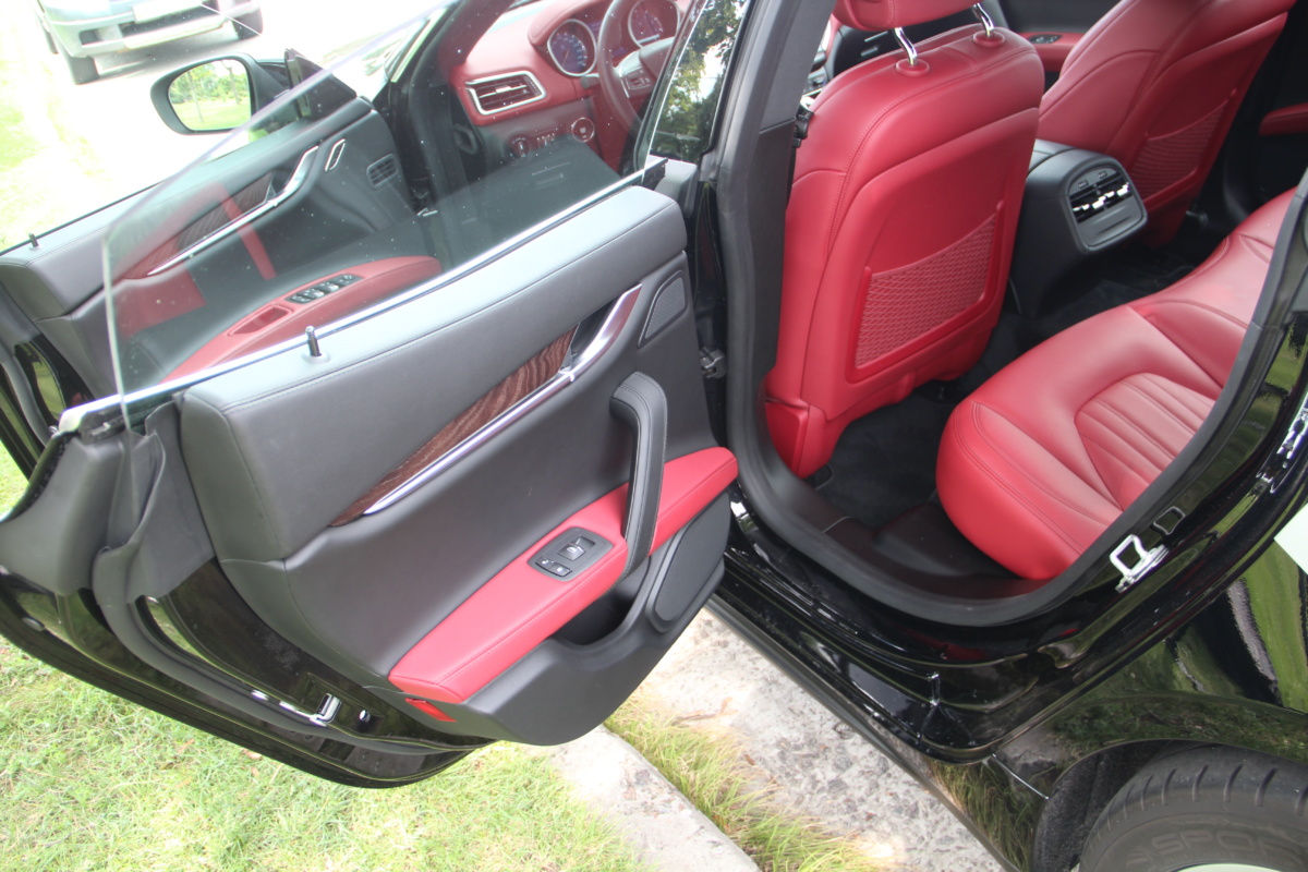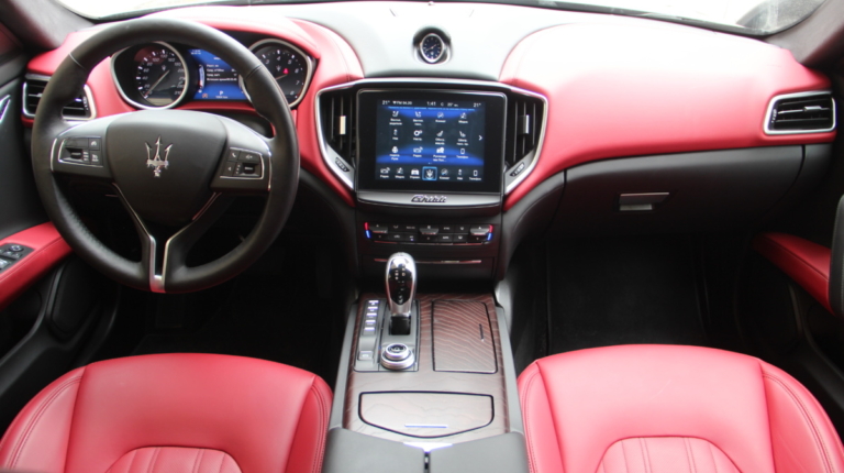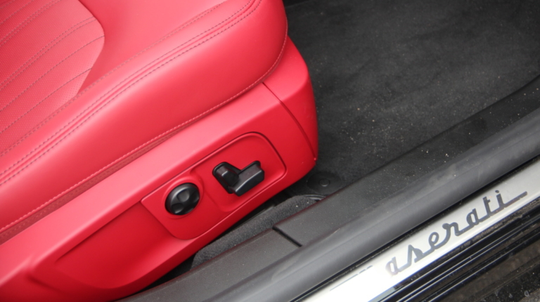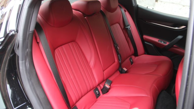 Как у Ferrari есть свой фирменный красный цвет для кузовов, так и у Maserati, похоже, есть характерный красный оттенок в отделке салона! Лично мне он напомнил модель 3200 GT – первая Мазерати, с которой мне довелось поближе познакомиться еще в начале 2000-х. Практически все элементы интерьера обшиты кожей, причем на дверных картах она полностью охватывает и торцы, что говорит о старании уделить внимание мелочам. Вариантов отделки может быть несколько и в тестовой машине далеко не самый роскошный. Но и салон тестовой Ghibli это царство кожи, так что оценивать приходится уже не мягкость пластиков, а ее выделку, строчку и так далее. Словно “обидевшись”, пластики здесь заметно уступают качеству кожи. Простоваты они для такого автомобиля как на вид, так и на ощупь.