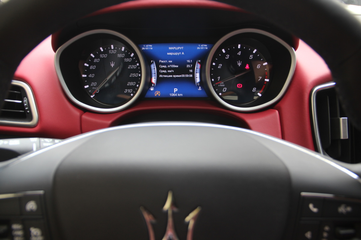 Под покатым капотом Ghibli притаился силовой агрегат V6: это твин-турбо мощностью 350 л.с. И это еще не самый мощный вариант. История данного трехлитрового мотора весьма интересна. Это совместная разработка Ferrari и Chrysler на основе блока Pentastar. Его производство стартует в Штатах, а затем мотор переправляют на досборку в Италию. Он обеспечивает седану отличную динамику! Разменяв первую сотню за 5.6 с, Ghibli охотно продолжает набирать скорость и так же легко “подхватывает” и со 120 и со 140 км/ч. Автомат ZF работает расторопно, разве что лепестков мне иногда не хватало. Но больше этого нервировала не всегда избирательная работа селектора, который приходилось переводить в нужное положение то перепроверяя, то несколько раз. Впрочем, начав движение на седане, про все эти мелочи забываешь практически сразу! Быстро подружиться удалось не только с мотором и КПП, но и с габаритами авто, что вызвало у меня небольшое удивление. Да и рулится седан легко и послушно, так что взаимопонимание у нас наступило быстро.