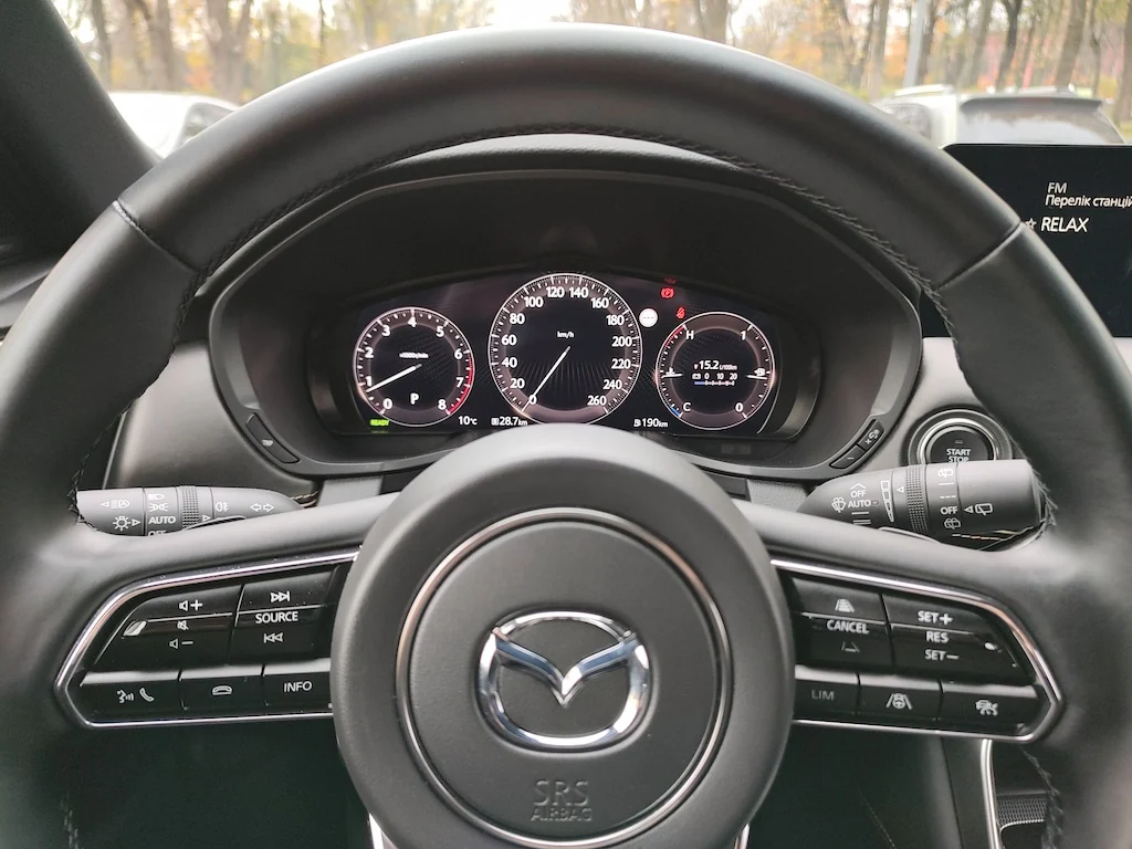 В іншому посадка за кермом комфортна, із запасом простору та регулювань навіть для високих водіїв та з фірмовими елементами Мазда. Не пухке кермо, взаєморозташування органів керування та приладів, пульт мультимедіа Mazda Connect під правою рукою - тут освоюєшься дуже швидко.