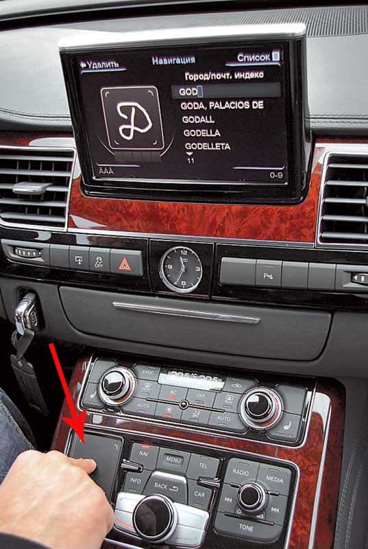 Машина «разговаривает» с нами на русском языке и понимает не только речь, но и почерк. Не отрывая взгляд от дороги, просто на поле MMI Touch пишу первую букву. Audi понимает и называет ее. Пишу следующие, и поиск становится более точным и предметным. А8 предлагает варианты треков, если я копаюсь в недрах аудиосистемы, или варианты названий улиц, когда нахожусь в меню навигационной системы MMI Plus.