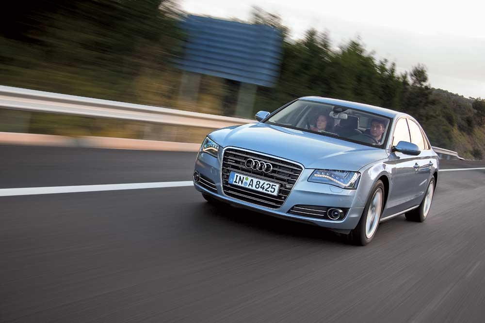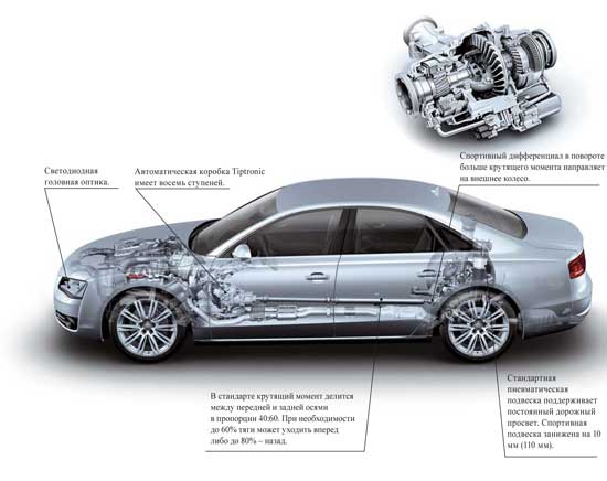 Пока все «а-восьмые» оборудованы фирменной системой полного привода quattro и 8-ступенчатыми автоматическими коробками. А предложенные для теста моторы – один лучше другого. Так, 3,0-литровый турбодизель (позже этот двигатель, дефорсированный до 204 л. с., установят на «бюджетный» моноприводный автомобиль) мощностью 250 л. с. показывает отличную экономичность – в среднем 6,6 литра на «сотню». Более мощный 4,2-литровый TDI (350 л. с.) просто рвет асфальт своими 800 Нм (!) крутящего момента, отчего появляется приятный холодок в груди. Будут ли ввозиться машины с этими моторами в Украину, еще не решено, а вот Audi А8 с 4,2-литровым бензиновым двигателем FSI мощностью 372 л. с. появится однозначно – по цене от 91 тыс. евро.