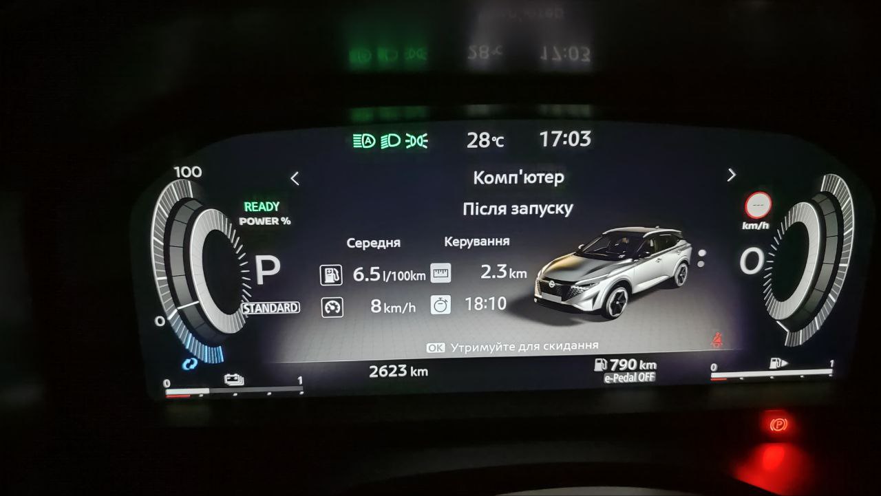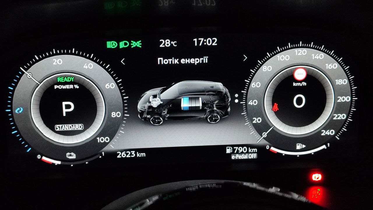 Силова установка e-Power має не тільки чималу потужність в 190 к.с., але й гарний крутний момент – 330 Нм. Вона легко справляється з вагою Qashqai (1624 кг). Машина доволі спритна та проворна. В міському потоці за рахунок рвучкого прискорення їздити легко та зручно. Тим більше зважаючи на доволі компактні розміри машини, особливо коли пересідаєш в нього з тестового редакційного X-Trail. До речі, в цих моделей дуже багато спільного. В салоні ті ж панель приладів, блок керування кліматом, екран інфорозважальної системи, кермо та селектор коробки передач.