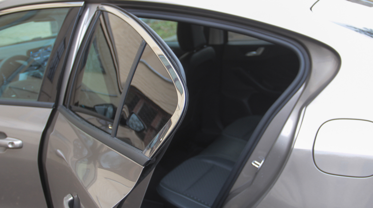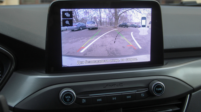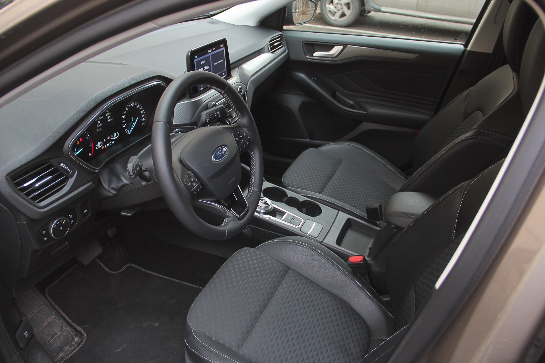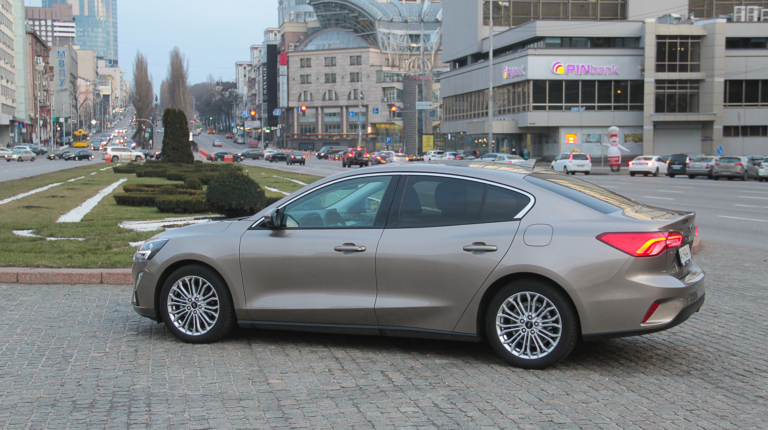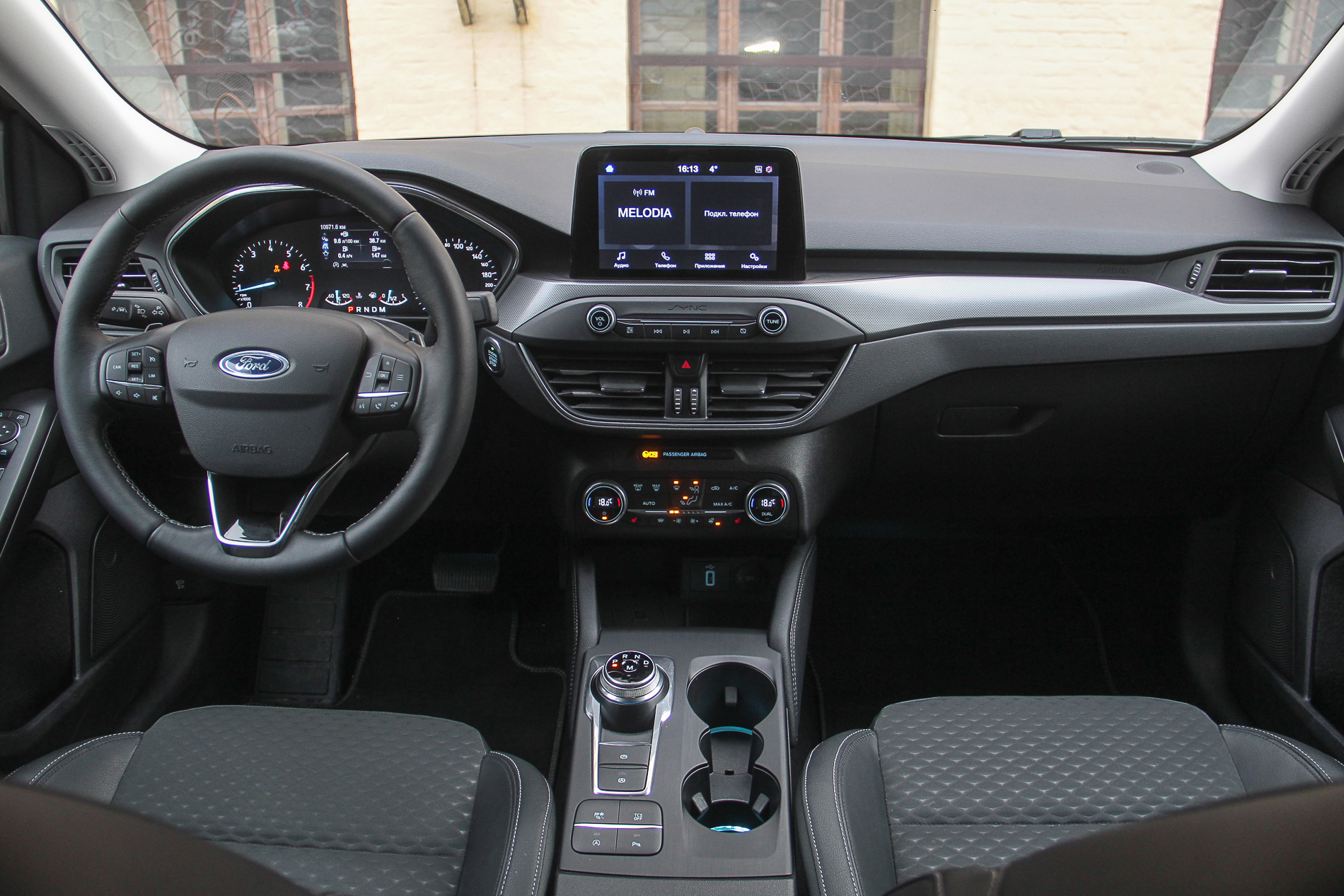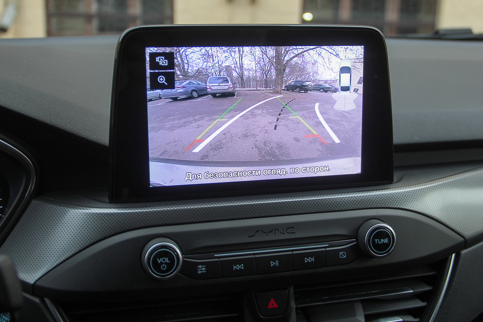 Что есть из оснащения в тестовой машине? Бесключевой доступ, двухзонный климат-контроль, мультимедийная система SYNC 2.5 с 8-дюймовым экраном, камера заднего вида с траекториями, комбинированная обивка сидений, подогрев руля, передних сидений и лобового стекла, датчики дождя и света, круиз-контроль с ограничением скорости, система удержания в полосе, полностью светодиодный головной свет. Конечно, это не все опции, но самые интересные из них. Так что оснащен Focus седан весьма неплохо.
