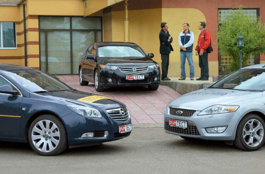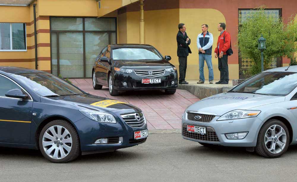 Раньше всех на арену вышел Ford Mondeo. В 2008 году он привлек особое внимание своими гигантскими, по тем временам, размерами для автомобиля сегмента D. Да что там, он не просто подобрался к границе с Е-классом, но и смело шагнул на территорию следующего класса. Яркая внешность машины, масса интересных решений и огромный список передовых технологий тогда не оставляли сомнений – Ford Mondeo заслужил звание «Автомобиль года в Украине». Однако массовым он так и не стал. Сказалась немалая на тот момент стоимость машины, которой была уготована роль флагмана. Совсем другая ситуация у второго участника сегодняшнего противостояния – Honda Accord. Она так же, как и Ford, существенно укрупнилась по сравнению с предыдущим поколением и стала богаче. Но в «абсолюте» конкурса на лучший автомобиль года первой не стала, хотя и возглавила средний класс. Однако на счету Accord другая важная победа. В рейтингах продаж в своем классе автомобиль неизменно находится в топ-тройке. Так что именно ему и быть сегодня тем ориентиром, на который будем равняться. Самый же молодой и амбициозный участник теста – Opel Insignia. Эта сверхновая звезда автомобильного небосклона стала сенсацией рынка. Подобно талантливому спортсмену, Insignia пронеслась по Европе, гроздьями собирая победы в различных конкурсах. Не стал исключением и украинский «Автомобиль года». Но, как известно, титул легче завоевать, чем удержать. Посмотрим, кто из нашей троицы окажется самым сильным. Для сравнения мы выбираем машины с топ-моторами. Ford оснащен мощным 5-цилиндровым двигателем 2,5 л, да еще и с турбиной. Он выдает 220 л. с. Однако доступен исключительно с механической коробкой передач. Для драйверских амбиций это явный плюс, но, по законам этого сегмента рынка, отсутствие «автомата» – моветон. Два других участника теста – с АКП. По мощности с Ford рядом стоит Opel, 2,0-литровый мотор которого с непосредственным впрыском и турбиной выдает те же 220 л. с. А вот топ-версия Honda Accord предлагает 2,4-литровый 201-сильный «атмосферник». Этого сегодня явно маловато. Пора японцам задуматься о более мощных моторах, особенно с учетом того, что совсем рядом бизнес-класс, где такой объем и мощность считаются не верхней планкой, а, скорее, стартовой чертой. Но проверим на практике, как распределятся места на нашем подиуме.