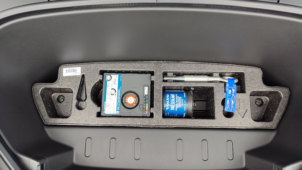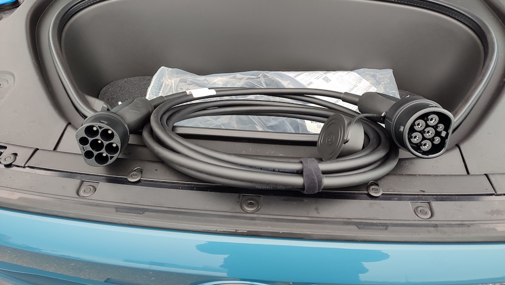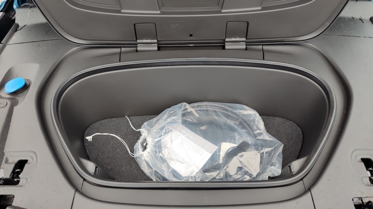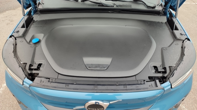 Під капотом все закрито пластиком. Є невелике вантажне відділення на 31 л, куди зручно класти зарядний кабель. А під підлогою цього відділення сховано ще компресор та реанімаційний комплект для ремонту пробитого колеса.