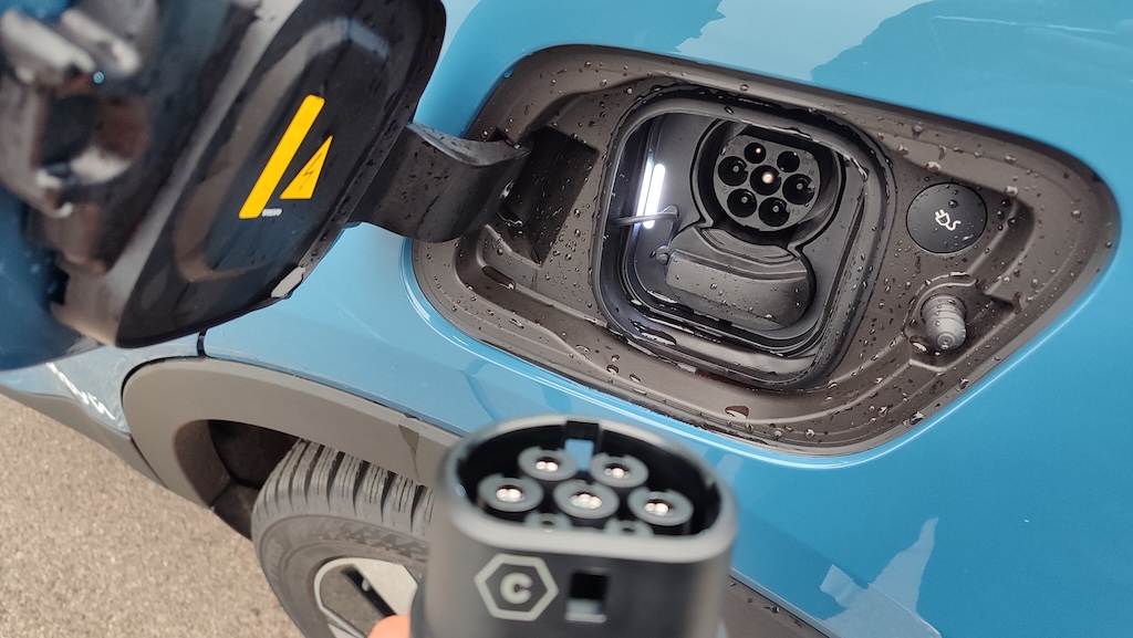 Зарядити С40 Recharge можна змінним струмом (повільна зарядка) за допомогою роз’єму Type 2, або постійним струмом (швидкої зарядки) з роз’ємом Combo 2. Швидка зарядка може отримувати до 150 кВт потужності на годину. Та треба пам’ятати, що ці дані актуальні для теплої погоди. Коли на дворі температура нижче нуля, то батарея не може з такою швидкістю споживати електроенергію. То ж початково авто обмежує споживання на рівні 50 кВт, а по мірі прогрівання батареї піднімає потужність. Так само автомобіль обмежує і динамічні показники та потужність авто, колли батарея холодна. Про це сповіщає і напис на панелі приладів.