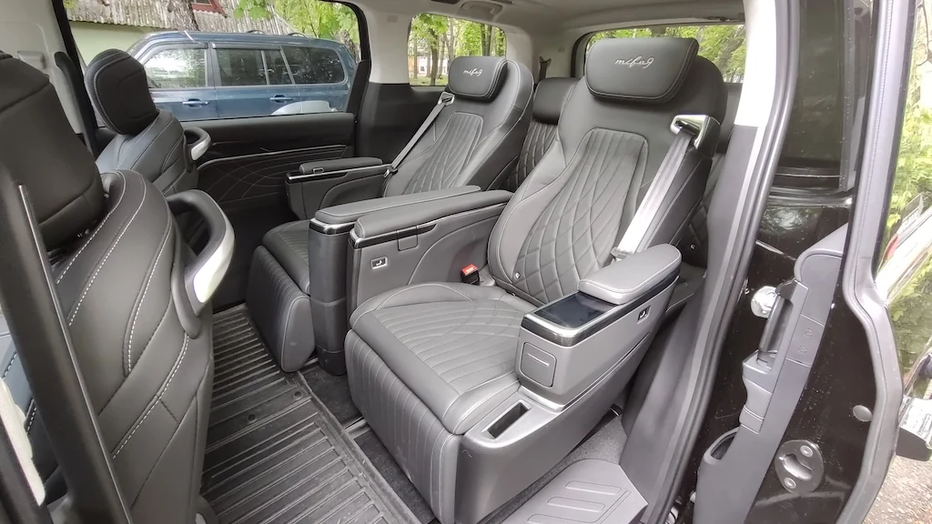 Maxus Mifa 9 - це не просто мінівен, це доволі розкішний бізнес-вен із вражаючими окремими кріслами другого ряду! Вони мають повне електро регулювання із широким діапазоном, включаючи навіть підголівник, регульовану підставку для ніг, вентиляцію та підігрів, а також функцію масажу із кількома варіантами на вибір І все це керується за допомогою цифрової сенсорної панелі в підлокітнику. На додачу у кожного з крісел є свій розкладний столик, що знаходиться відповідно в іншому підлокітнику. Тож можна насолодитися розслаблюючою та комфортною поїздкою, а за необхідності і попрацювати за ноутбуком. Розетка тут також є і її приховано у висувному боксі центрального (водійського) підлокітника.