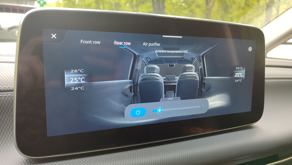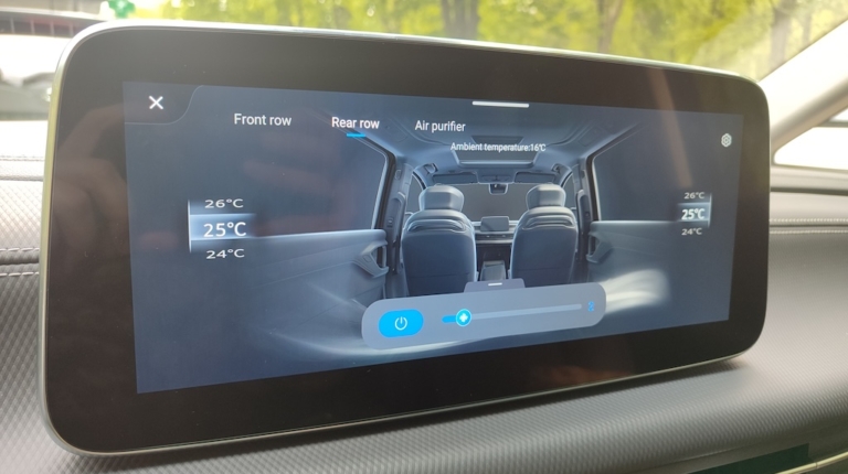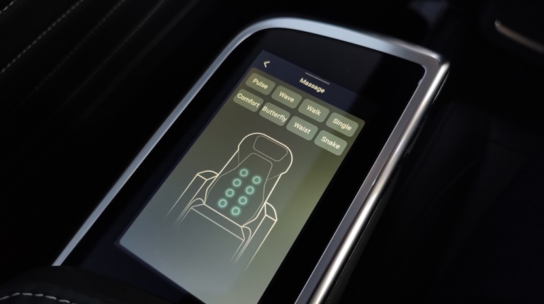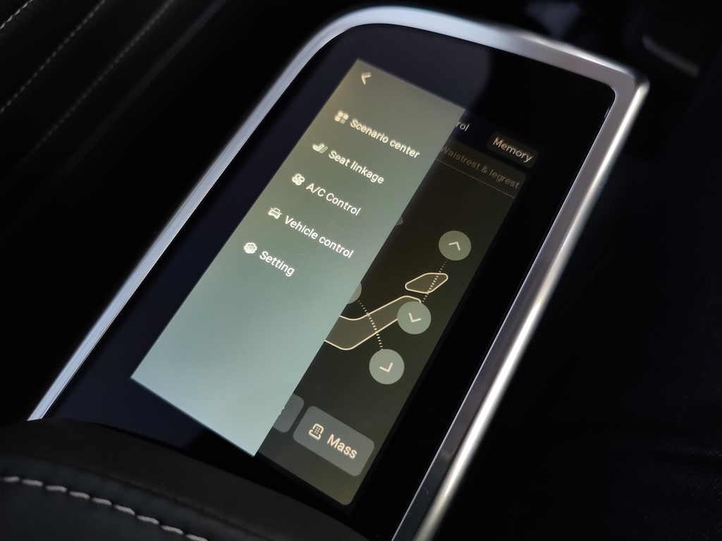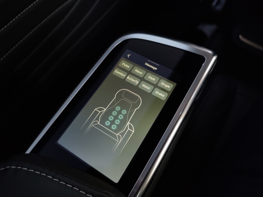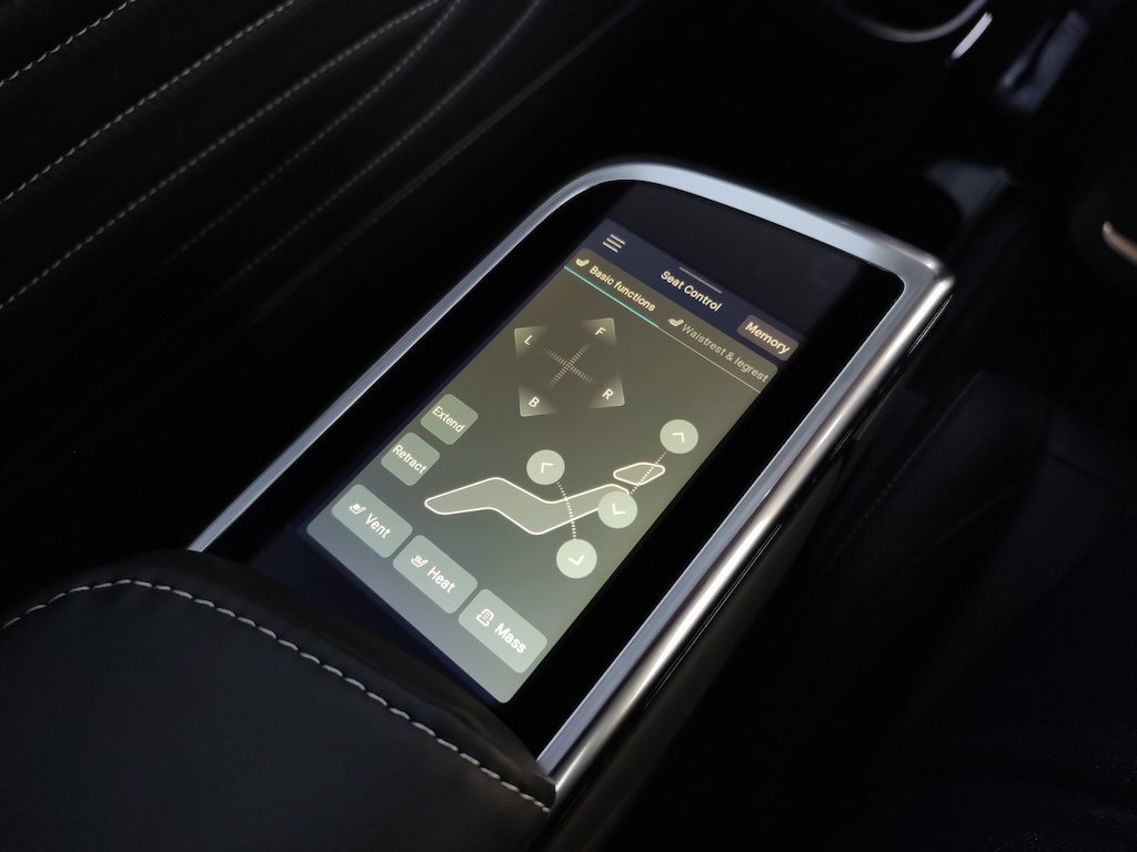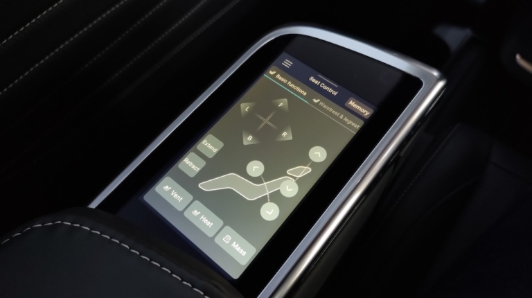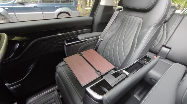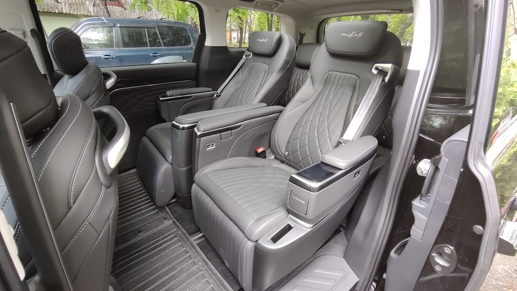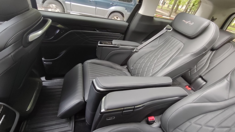 Maxus Mifa 9 – це не просто мінівен, це доволі розкішний бізнес-вен із вражаючими окремими кріслами другого ряду! Вони мають повне електро регулювання із широким діапазоном, включаючи навіть підголівник, регульовану підставку для ніг, вентиляцію та підігрів, а також функцію масажу із кількома варіантами на вибір І все це керується за допомогою цифрової сенсорної панелі в підлокітнику. На додачу у кожного з крісел є свій розкладний столик, що знаходиться відповідно в іншому підлокітнику. Тож можна насолодитися розслаблюючою та комфортною поїздкою, а за необхідності і попрацювати за ноутбуком. Розетка тут також є і її приховано у висувному боксі центрального (водійського) підлокітника.