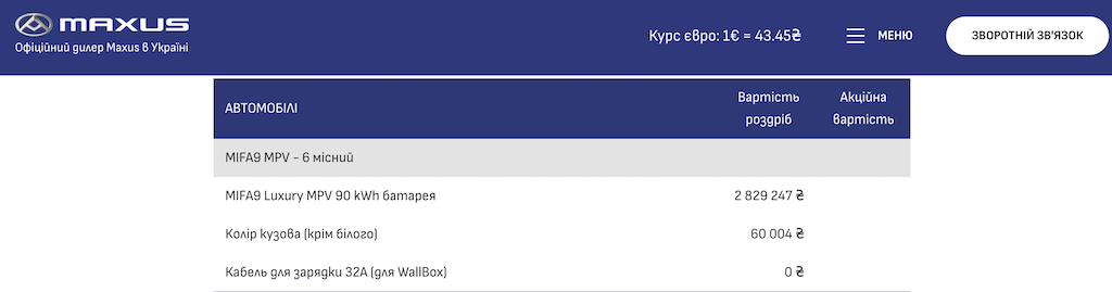 Maxus Mifa 9 пропонується в єдиній версії – з батареєю на 90 кВт*год, електродвигуном потужністю 245 к.с., переднім приводом, і ось у такій самій комплектації, як тестовий автомобіль. Його вартість – трохи більше ніж 2,8 млн гривень, тобто приблизно 70 тисяч доларів.