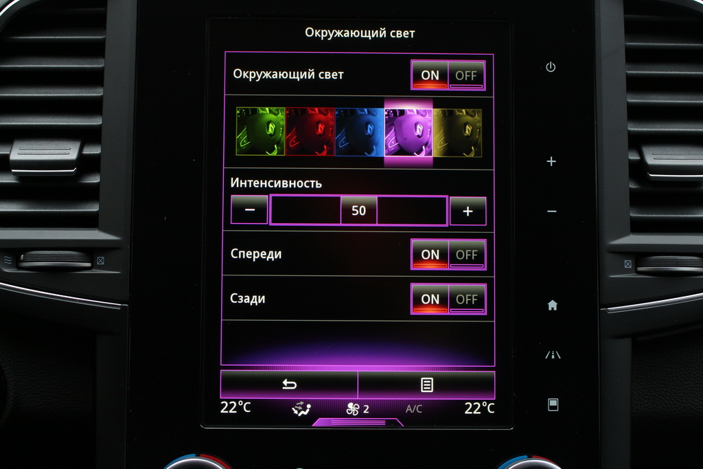 Подогрев передних кресел есть во всех комплектациях. Вентиляция передних сидений предлагается только для самого дорогого исполнения Intense. Для включения обогрева лобового стекла нет отдельной кнопки. Он активируется при включении максимального обдува лобового стекла вместе с обогревом заднего окна и зеркал.