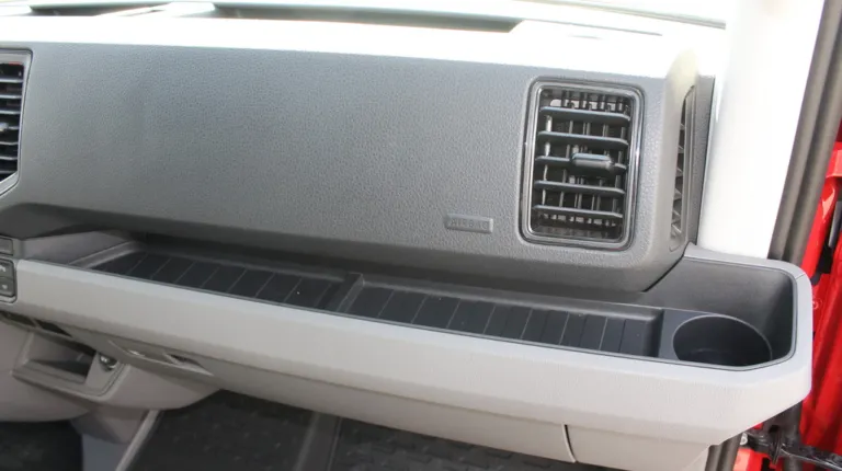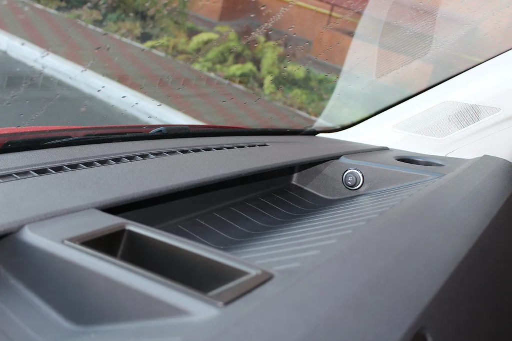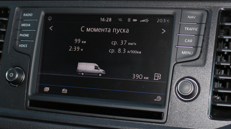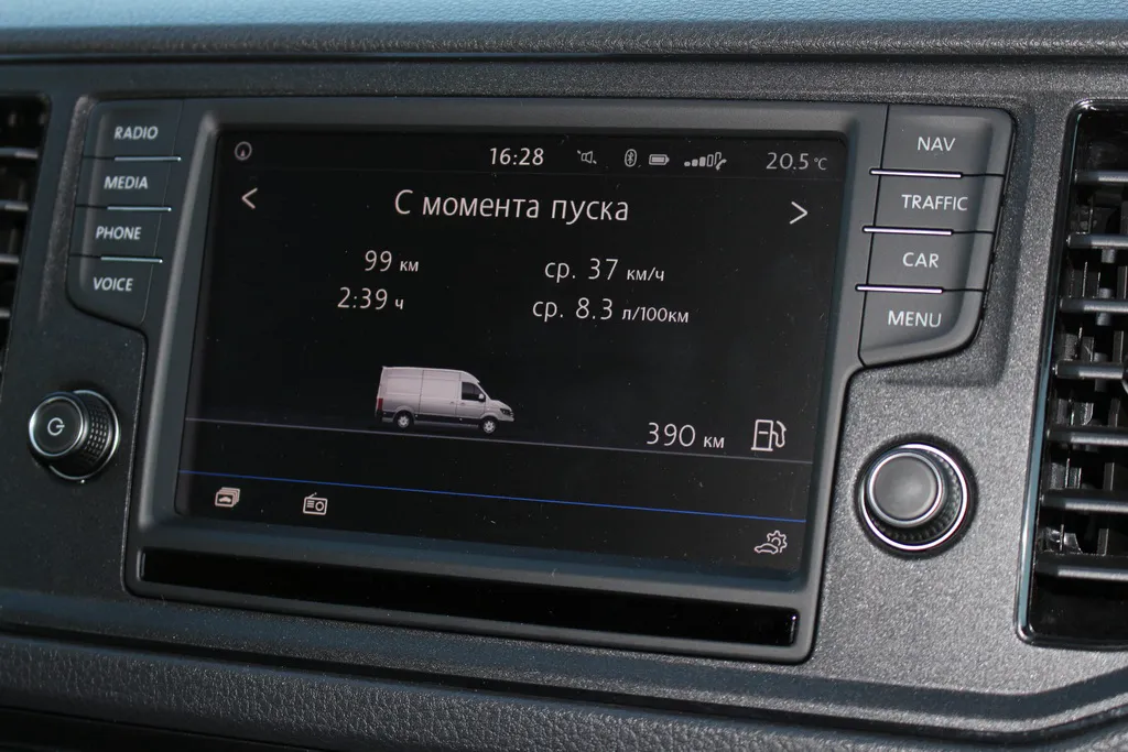 Знакомая передняя панель от Volkswagen Т6 Transporter явно более узкая, чем кузов Крафтера. Поэтому торпедо словно уложили на более широкий подиум с открытыми полками и подстаканниками.