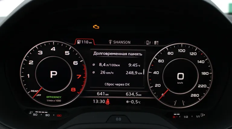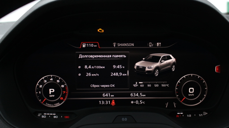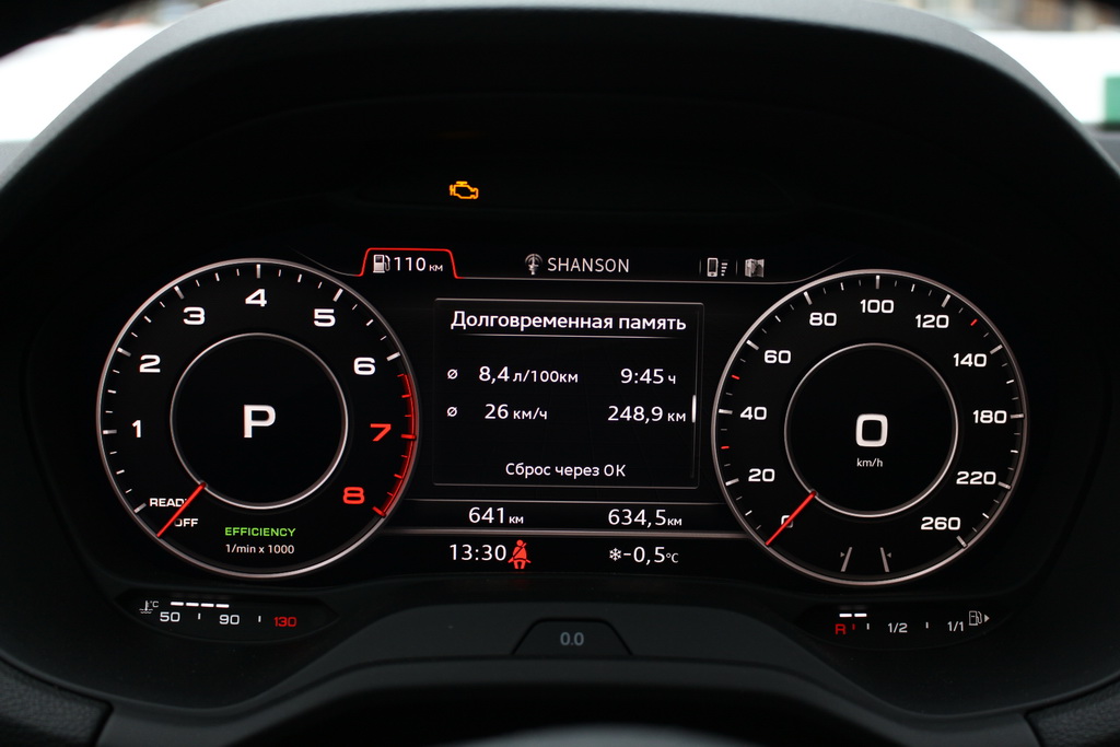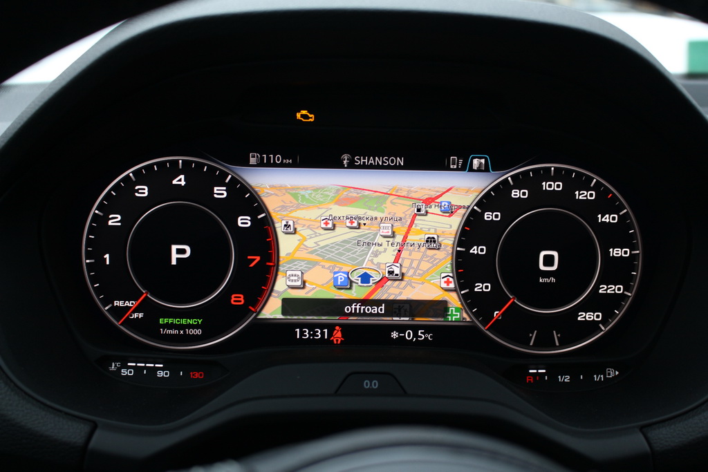На нашій машині стоїть віртуальний щиток приладів. Це збільшило вартість машини не на одну сотню євро, проте він максимально інформативний. Ми вже зустрічалися з віртуальною приладовою панеллю, проводячи тест-драйв Audi Q7. Вона тут не гірша, ніж на флагманському кросовері.