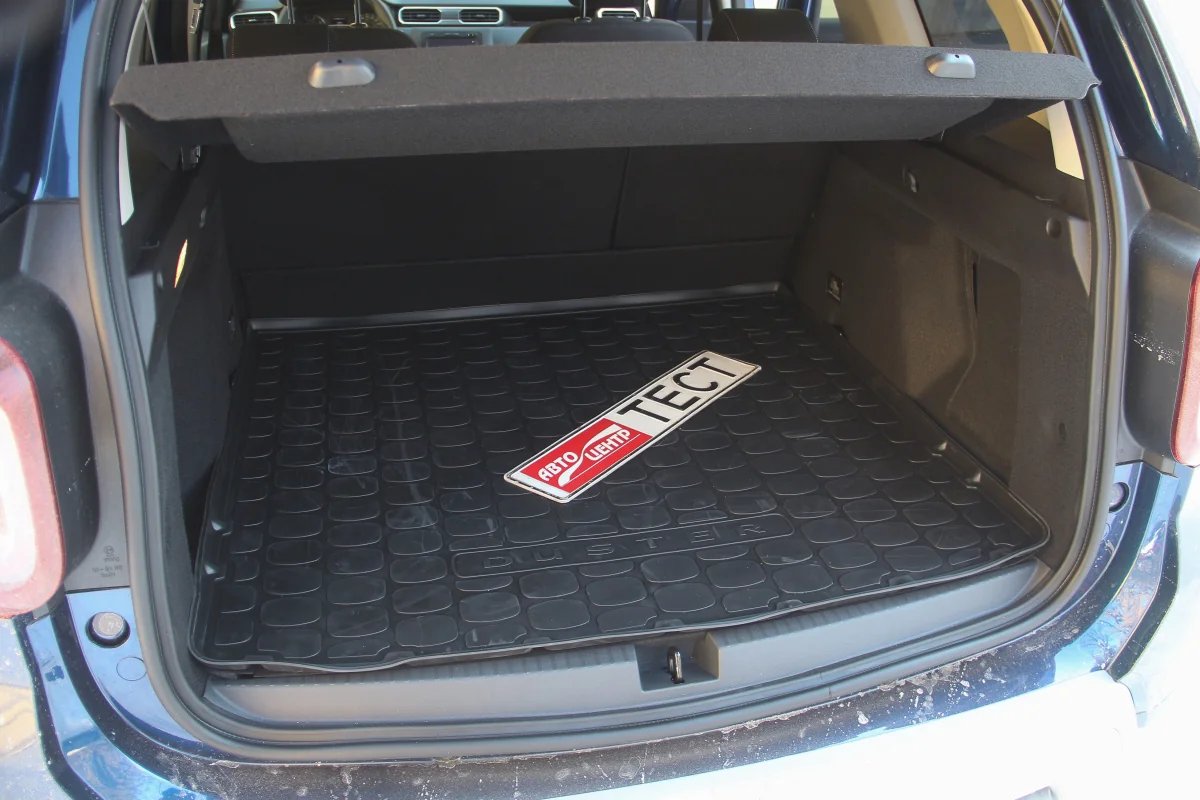 Об'єм багажника у Renault Duster залежить від типу трансмісії. Якщо вона повнопривідна, як на тестовому автомобілі, він становить 376 літрів. Це трохи менше, ніж у минулому поколінні, але тільки через гладкі стіни багажного відсіку. Зате під фальшпідлогою у вас повнорозмірне запасне колесо. Загалом обробка стала більш добротною, пішло відчуття бюджетності. А ще сподобалося, що полицю, що прикриває багаж, залишили жорсткою.