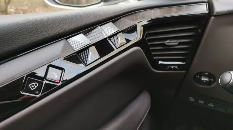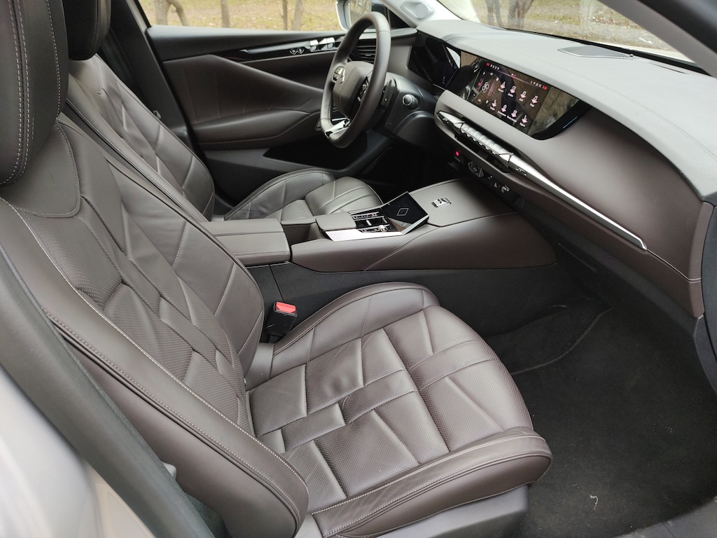 І ось саме благородний коричневий відтінок шкіри та її домінування в оздобленні салону створюють його сприйняття і внутрішню атмосферу. Адже шкіряні тут не тільки сидіння, а й передня панель, центральна консоль та карти дверей. Звісно ж, увагу деталям приділили і тут. Ансамбль оздоблення доповнюють вставки з натурального ясеня та чорного лакованого пластику, а також металізовані сріблясті елементи. Зазначу, що без доплати салон також буде шкіряний, але не такий ошатний.