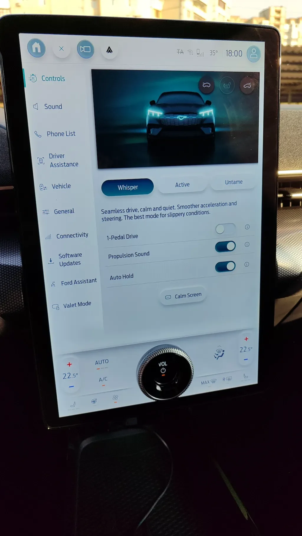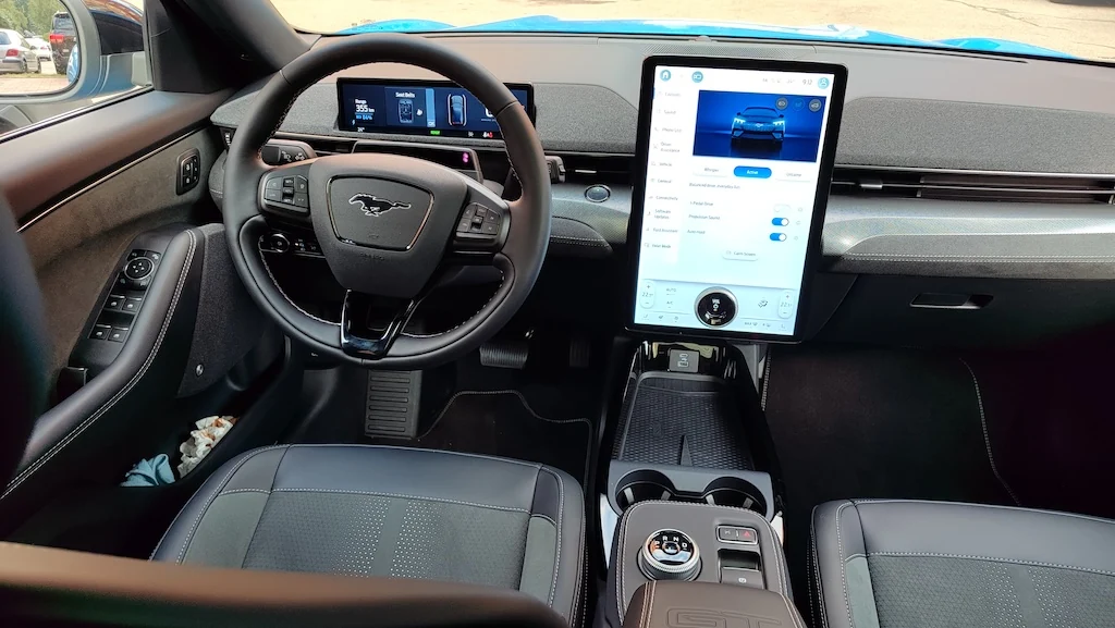 Як не дивно, але найбільше асоціацій з купе Мустангом виникли не коли я дивився на авто ззовні, а коли сів за кермо. Перед очима широкий і довгий капот з характерними двома гребнями по краях. Все як в звичайному Мустангу. Але сам салон ніяк не нагадує легендарний спорткар. Тут хайтек та сучасність. В центрі консолі величезний вертикальний планшет на 15,5 дюймів. Але в нього є зручна особливість. В нижній частині розташована мультифункціональна «крутилка».