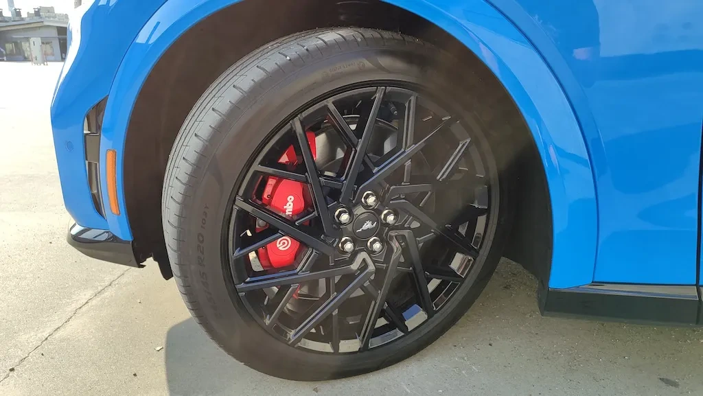 Цікаво, що сприйняття дизайну Mustang Mach-E сильно залежить від його кольору. Зустрічав в місті кілька машин сріблястого та жовтого кольору. Чесно – ніяк не вразило. Машина як машина. А от яскраво блакитного, як наш тестовий – відразу кидається в очі. Не останню роль у сприйнятті грають і 20-дюймові колісні диски.