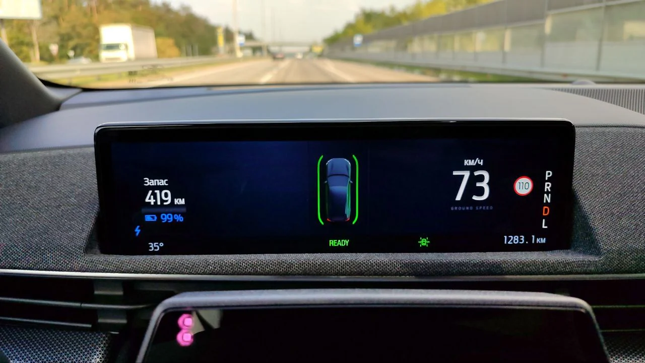 Що стосується електричної складової машини, то велика батарея на 98 кВт*год на практиці пропонує 88 кВт*год ефективної ємності, якими ви реально можете скористатись. При 100% заряду машина пообіцяла нам 420 км пробігу. І на практиці так і вийшло. Це трохи менше за обіцяні по характеристим 500 км запасу зоду топової версії, але і режим нашого руху був далеким від стандартів виміру WLTP.