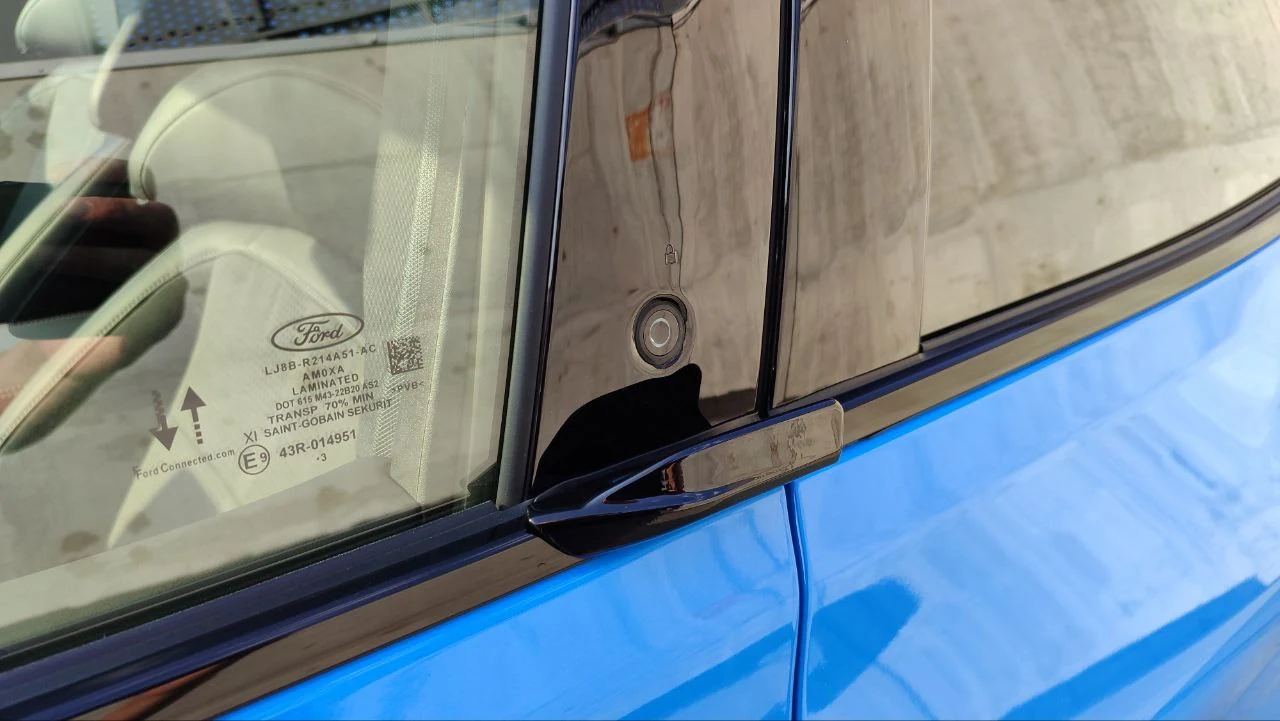 Одною з дизайнерських фішок Mustang Mach-E стала відсутність дверних ручок. Замість них на дверях кнопка, після натискання якої двері розблокуються. А що відкрити їх треба потягнути за невелике крильце. Може виглядає оригінально, але зручним я це не назвав би.
