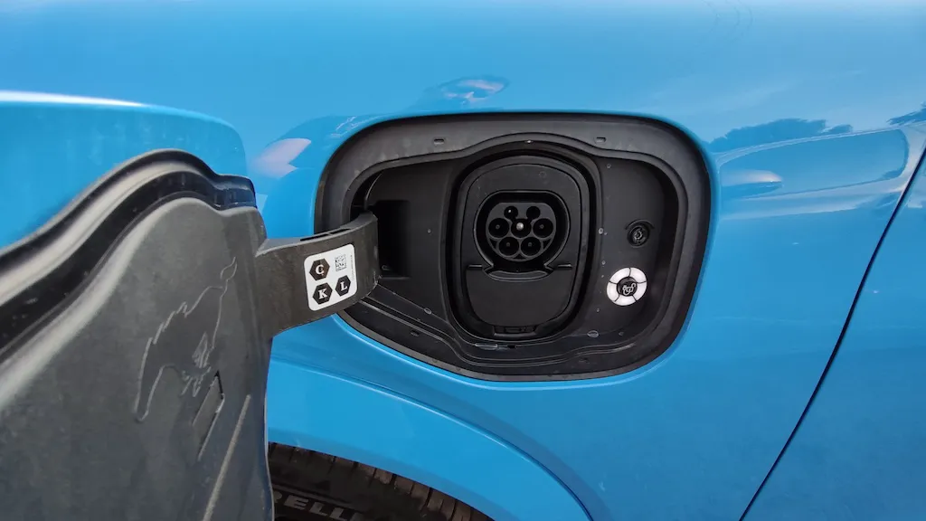 Щодо зарядки, то тут є два варіанти. Якщо заряджати авто за допомогою змінного струму через трифазний дріт, то машина здатна споживати до 11 кВт на годину. Якщо в вас в гаражі є така розетка, то за ніч цілком можна повністю зарядити батарею свого Mustang Mach-E. А якщо використовувати швидкі комерційні зарядні станції, то авто здатне споживати через розʼєм Combo2 потужність до 120 кВт.