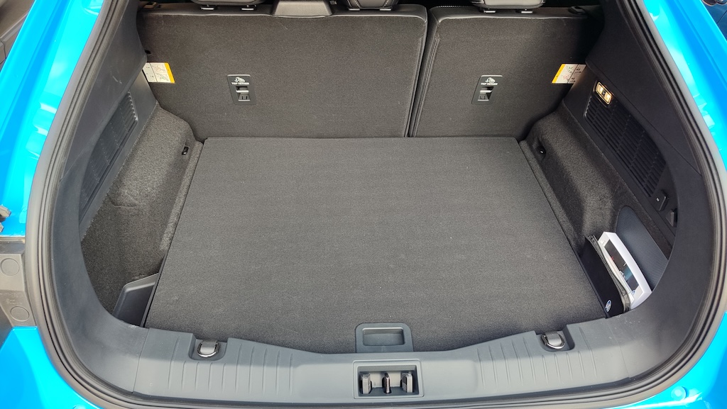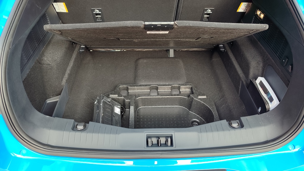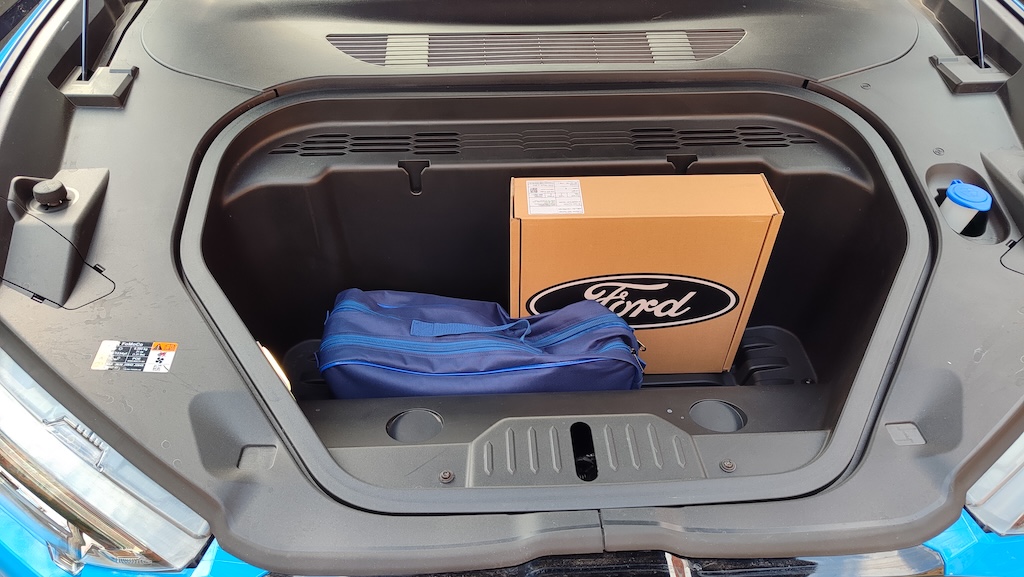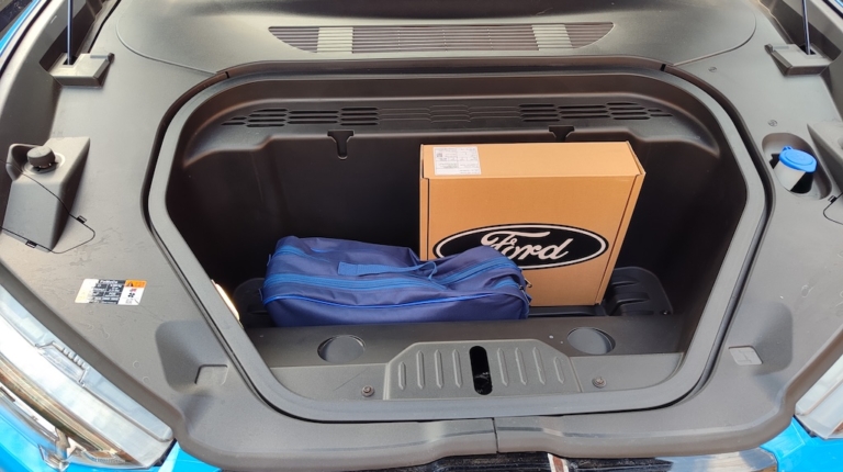В Mustang Mach-E два багажника. Задній немалий – 402 л. Але в додаток до нього є ще передній на 81 л. Тут зручно зберігати кабель для зарядки. Навіть якщо він після використання не дуже чистий, то потім пластикове оздоблення переднього багажника легко витерти та почистити.