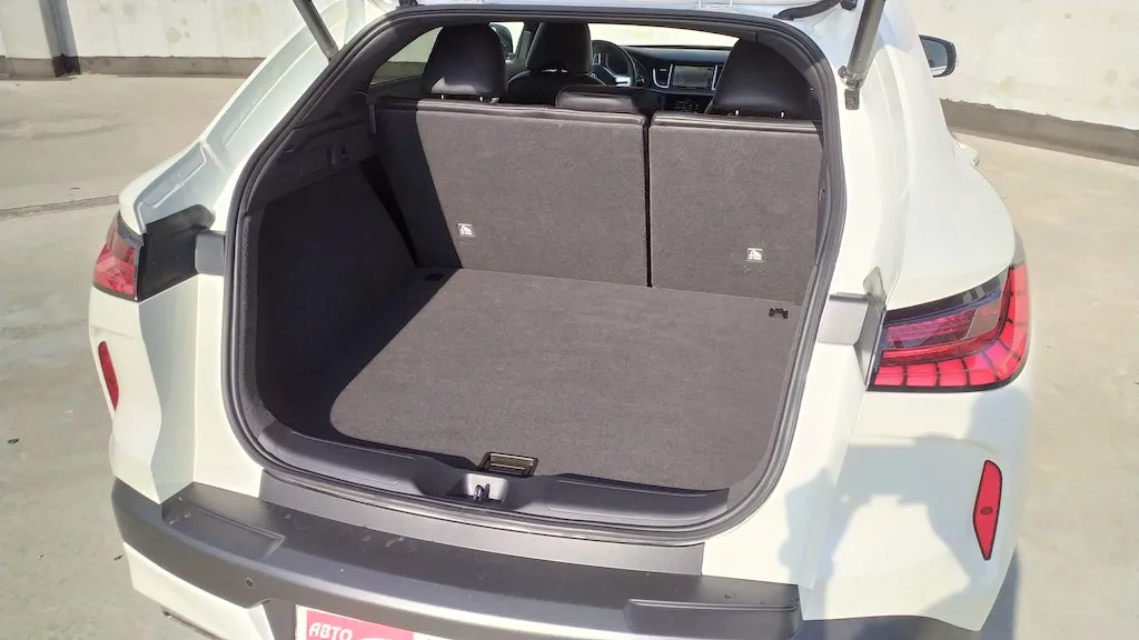 Похила лінія задньої стійки не сильно з’їла простір над головою задніх пасажирів. Та й навряд таке авто обирають для використання як сімейне. Тут логічніше обрати EQ50. Щодо місткості багажного відсіку то тут все ок. Його обʼєм чималий – 555 літрів, а кришка багажника відкриває великий проєм для завантаження.