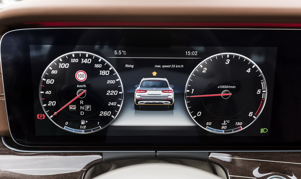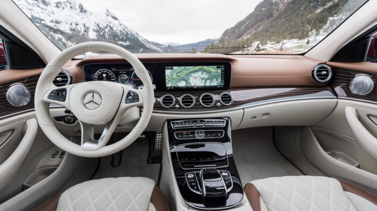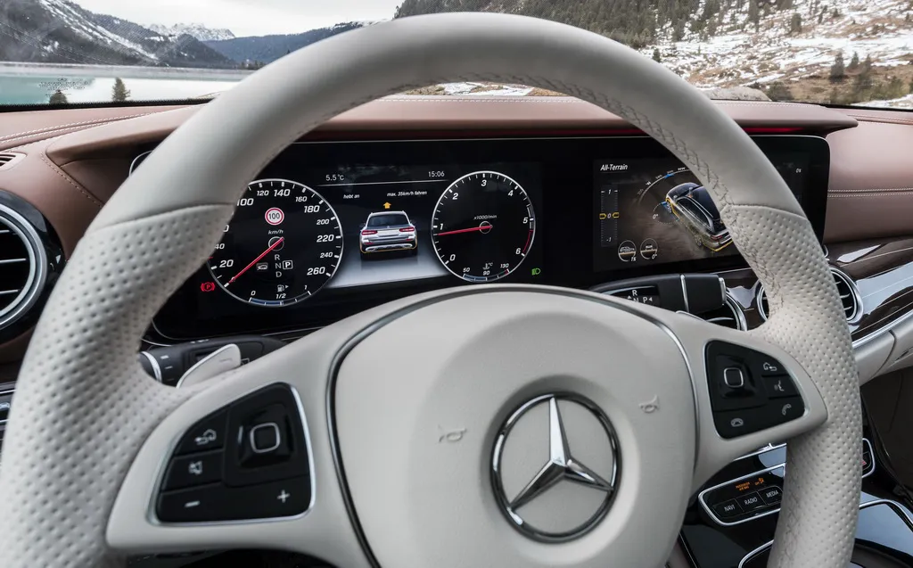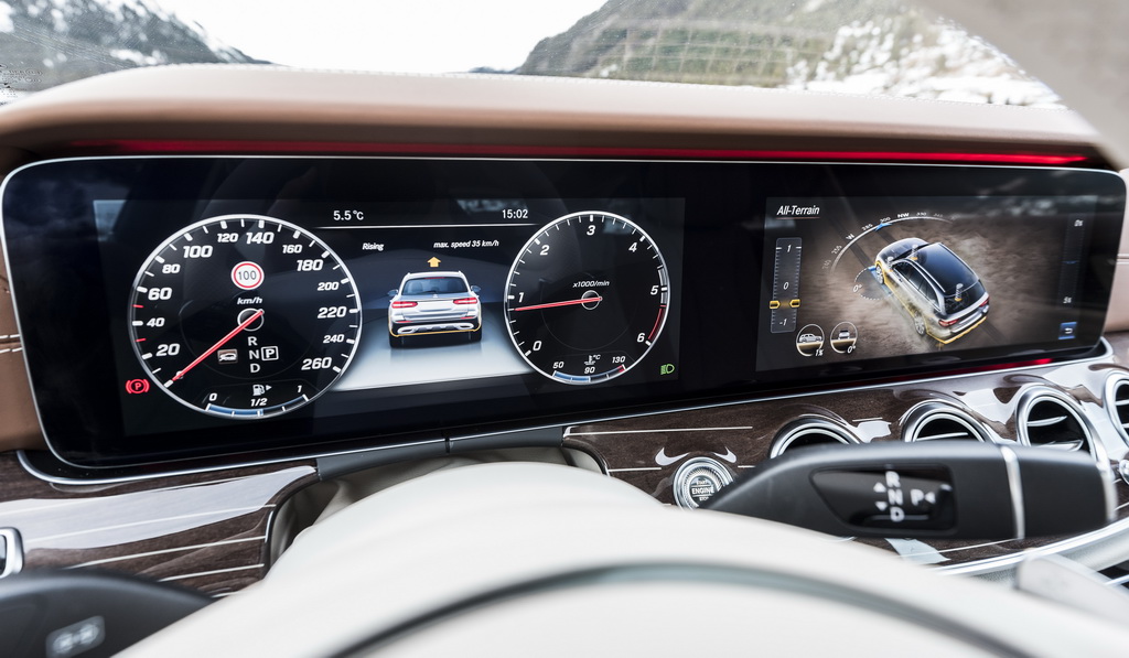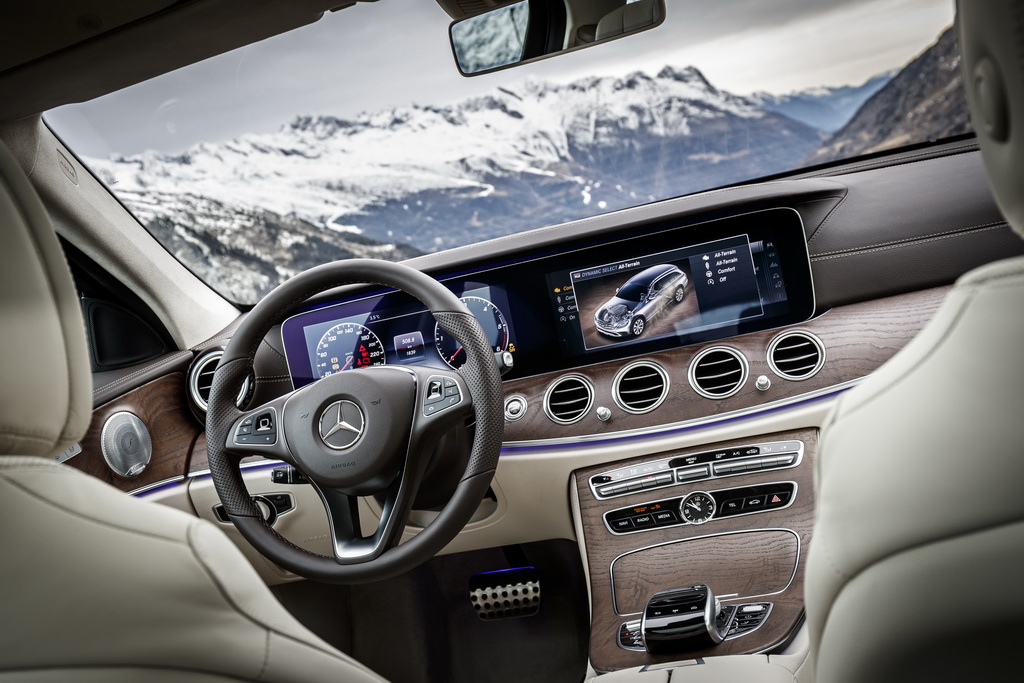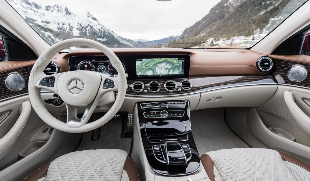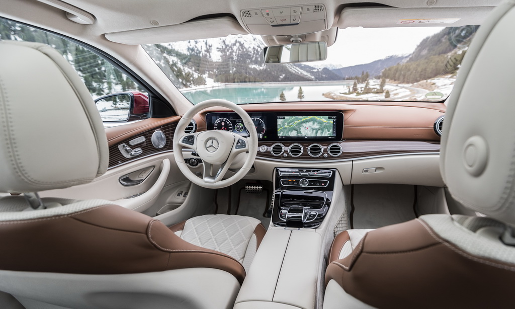 Дизайн салону практично стандартний, якщо взагалі щодо нового Е-класу доречна така характеристика. Це логічно: якщо зовнішні елементи мають увиразнити ексклюзивність версії і водночас несуть практичне навантаження, то в салоні навряд чи покупець захоче щось відмінне. Через це набір невеликий: спортивні педалі (нержавійка з гумовими вставками), особливі килимки, можливість замовити оздоблення «алюміній/карбон». У нас на тесті була версія з «деревом». І особисто я не такий прогресивний, щоб поміняти благородну деревину на карбон. Mercedes-Benz E-класу – не спорткар, і позашляховий стайлінг не робить його менш аристократичним. Австрійські Альпи – ось його середовище проживання, ви сьогодні в Зеєфельді підкорюєте схили, а завтра вивантажуєте лижі, вантажите дошки і вирушаєте в Португалію на серфінг. У програмі немає наметового містечка на Південному Бузі. Тому і позашляхові здібності цього автомобіля відповідають призначенню. Коронна фраза – «згодиться для форсування бордюрів» – тут просто недоречна: на бордюр, звісно, заїхати можна, але чи варто? Що за дитинство?